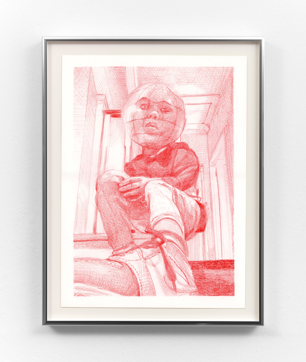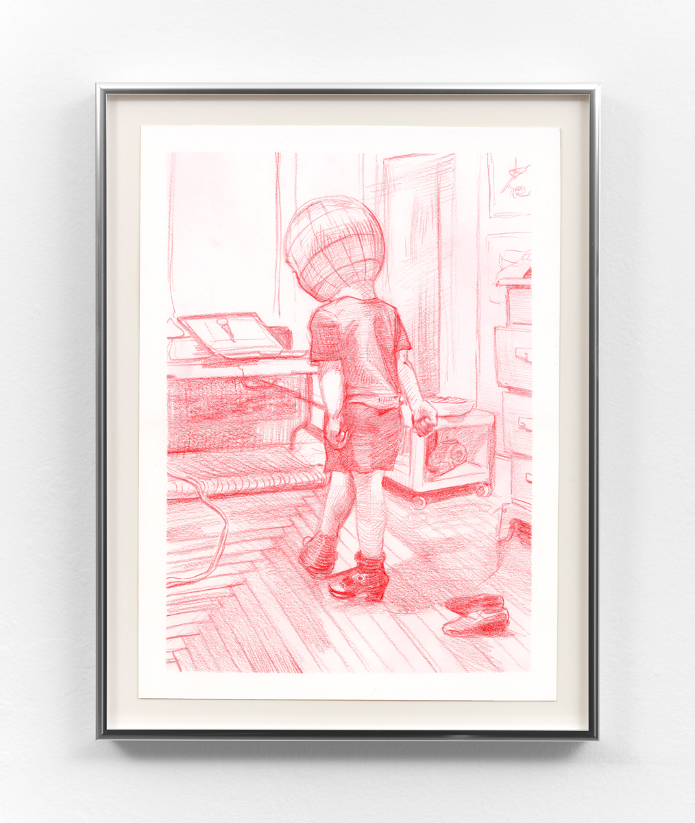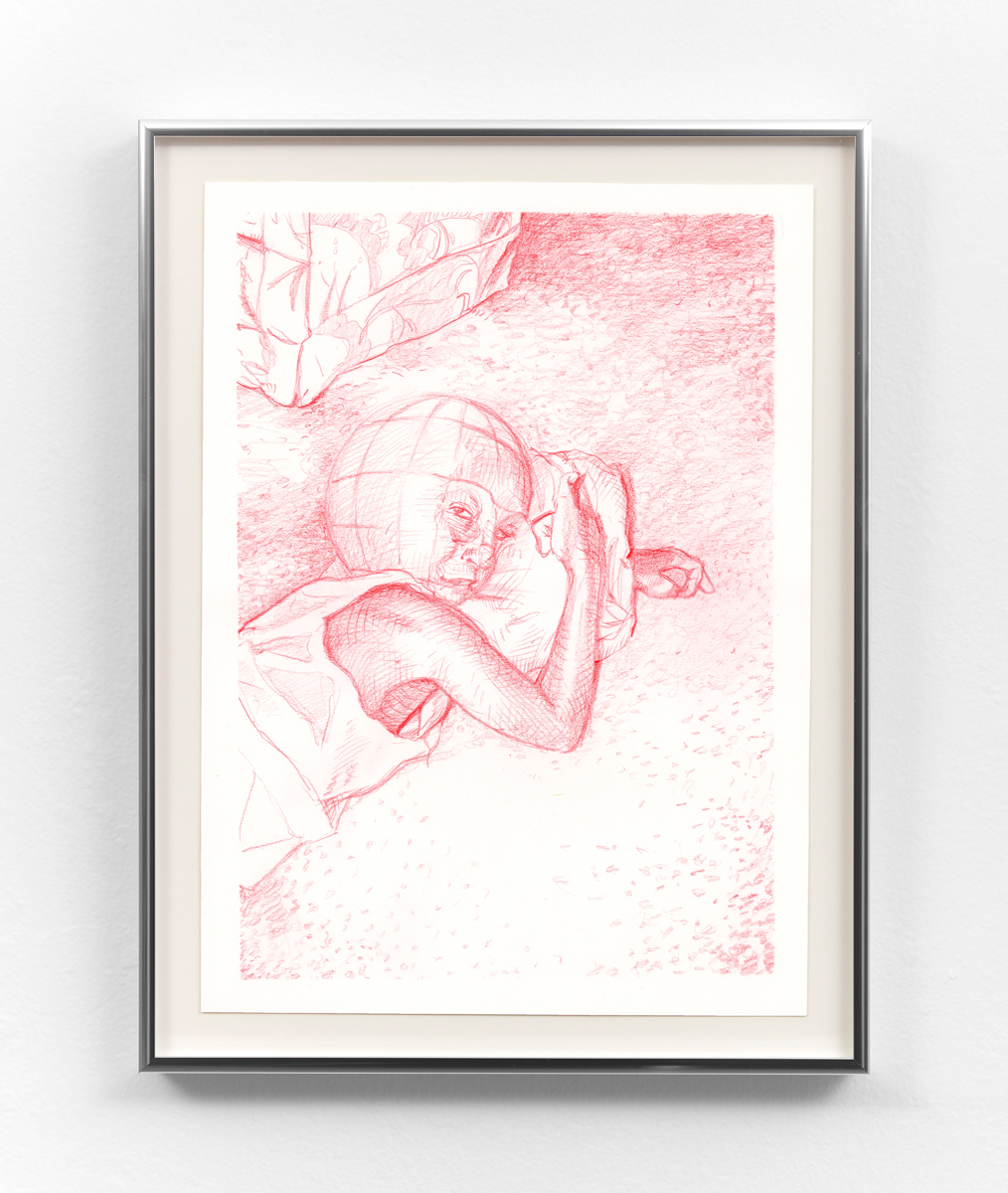 The marquee motif of David Muenzer’s New York debut may strike you as almost goofy: in one painting and a suite of vibrant, deft figurative drawings in red pencil, he has transformed the head of each of those depicted into a globe, inscribed with contour lines as if out of an art textbook. The figures vary in demeanor and garb, as do the scenes they inhabit, and their too-small faces fit onto the spheres awkwardly—recessed like depressions on an underinflated basketball, poking out like Groucho Marx schnozz-and-glasses. The most contemporary of them confronts us in a selfie, phone propped improbably on the floor with their Air Jordan Mid thrust up practically against the lens. Another meets our gaze languorously as she reclines on a carpeted floor. A third, who seems a child or young adolescent, poses awkwardly as she examines her image on a laptop screen: the twenty-first century’s mirror-stage, checking one’s looq before a video chat. The visitor to the exhibition takes all this in while standing atop one more work, a gray industrial carpet patterned with pink, yellow, and light blue geometrical shapes. It depicts a conflict-themed tactical flowchart that flows nonsensically in every direction. A sample question: “How do you want to win?” One of the more cogent responses: “Making my opponent regret the life choices that led to this match.”