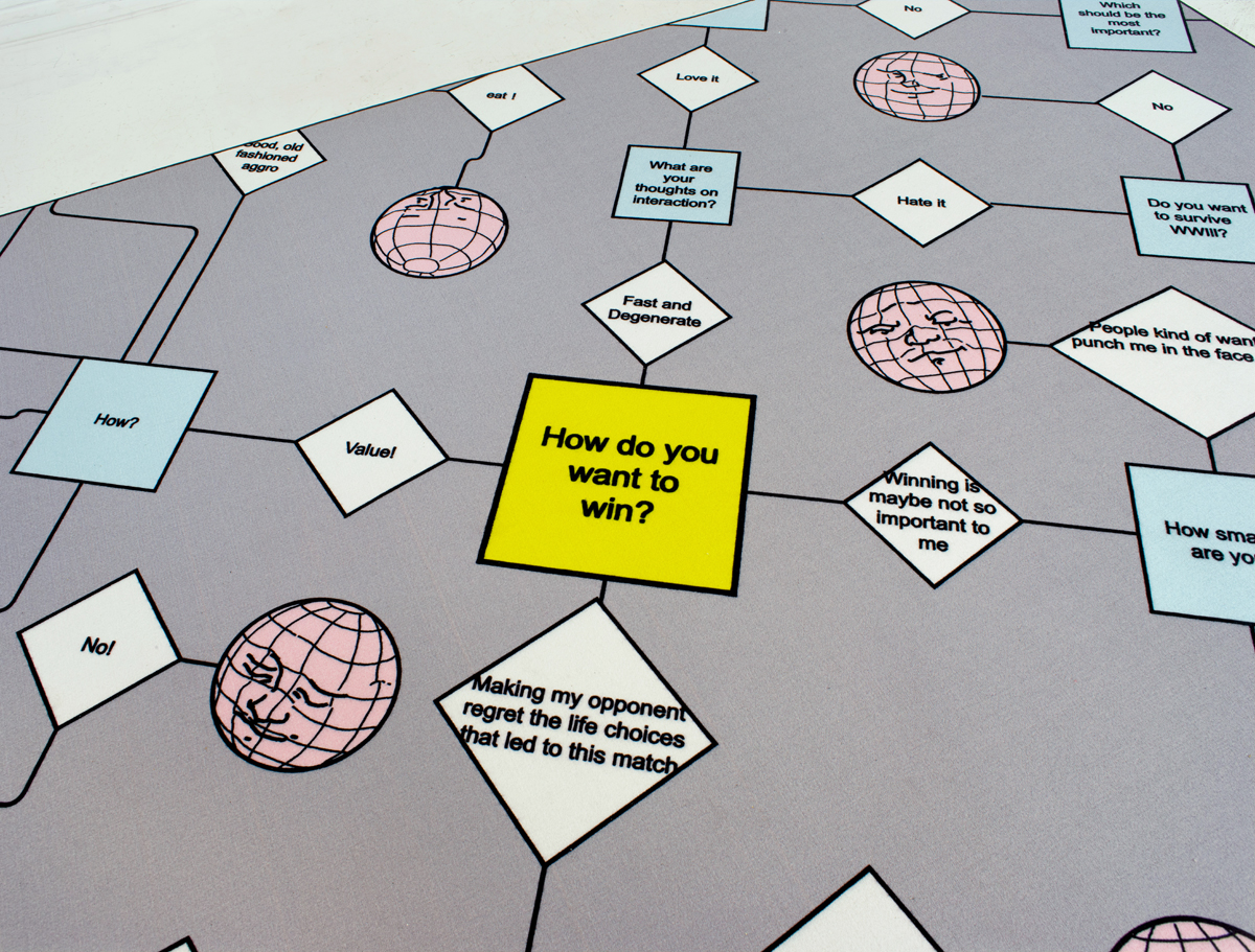 By unexpectedly surfacing photography also here, Muenzer makes the machinery of vision the exhibition’s root note. In modern times, vision is intimately connected to power; if you can’t take my word for it, take Foucault’s. Realism, as an asymptotic pursuit to ever-more-exactly capture the world, is ultimately a pursuit of control. Da Vinci, recall, applied his red chalk to both exquisite renderings of the human form and diagrams for machines of war. Today, the realism of Courbet is left in the dust of the French countryside; we’re increasingly accustomed to scraping away the visual in favor of what underpins its digital forms. That shitposty decision-tree carpet that lies underfoot, titled How to Compete (2020–22), represents sarcastic strategies for playing the card game Magic: The Gathering. Unlike an actual decision tree, which imposes a rationalizing flow of one choice into another, this one sprawls indefinitely and aimlessly, just a bunch of dopey questions and wiseass answers spreading toward every point of the compass. “How smarmy are you?” a sample node asks. Choices: “Not very,” “OK, a little,” “Winning is maybe not so important to me,” and “People kind of want to punch me in the face.” Decisions lead inevitably to dead ends where one is met by one of Muenzer’s globe heads with a sardonic, smug, or disapproving mien. The Enlightenment as final boss?