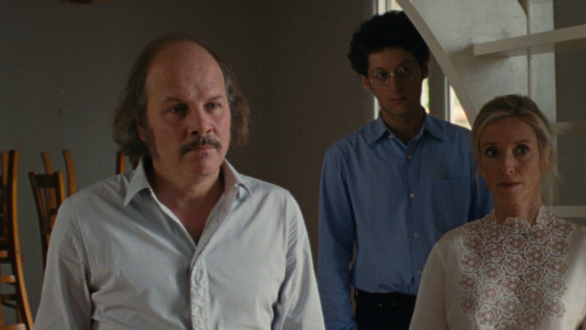 Philippe Katerine as Antoine Maserati, Grégoire Montana as Romain Maserati, and Léa Drucker as Aurélia Maserati in Petite Solange. Courtesy the Brooklyn Academy of Music. © Aurora Films.