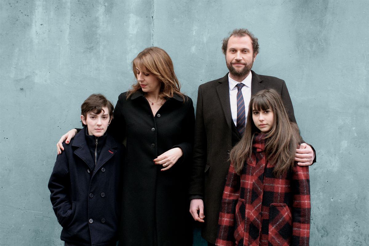 Valentin Vigourt as Benjamin, Valérie Benguigui as Marianne, François Damiens as Simon, and Léopoldine Serre as Delphine in The Wolberg Family. Courtesy the Brooklyn Academy of Music.
