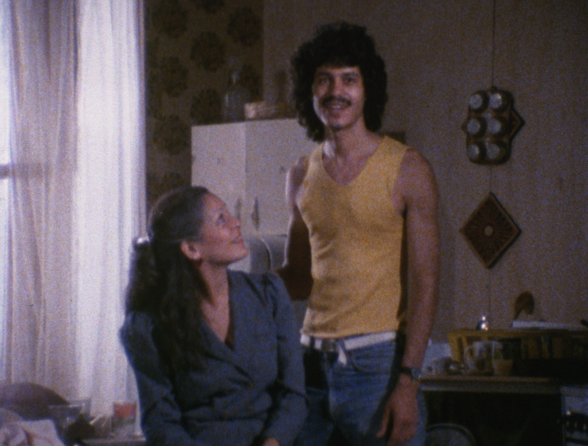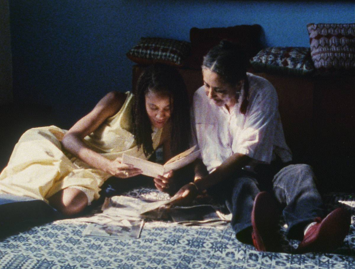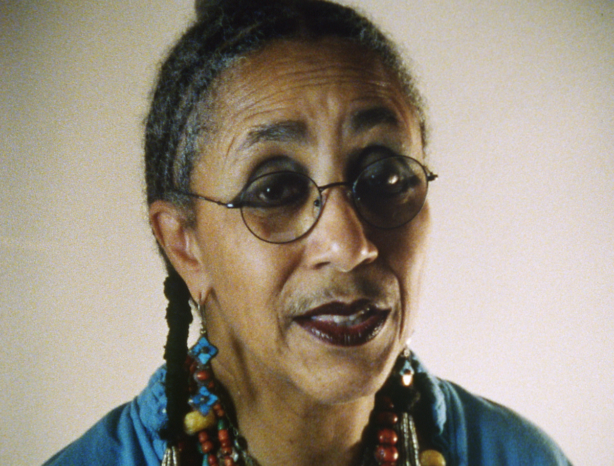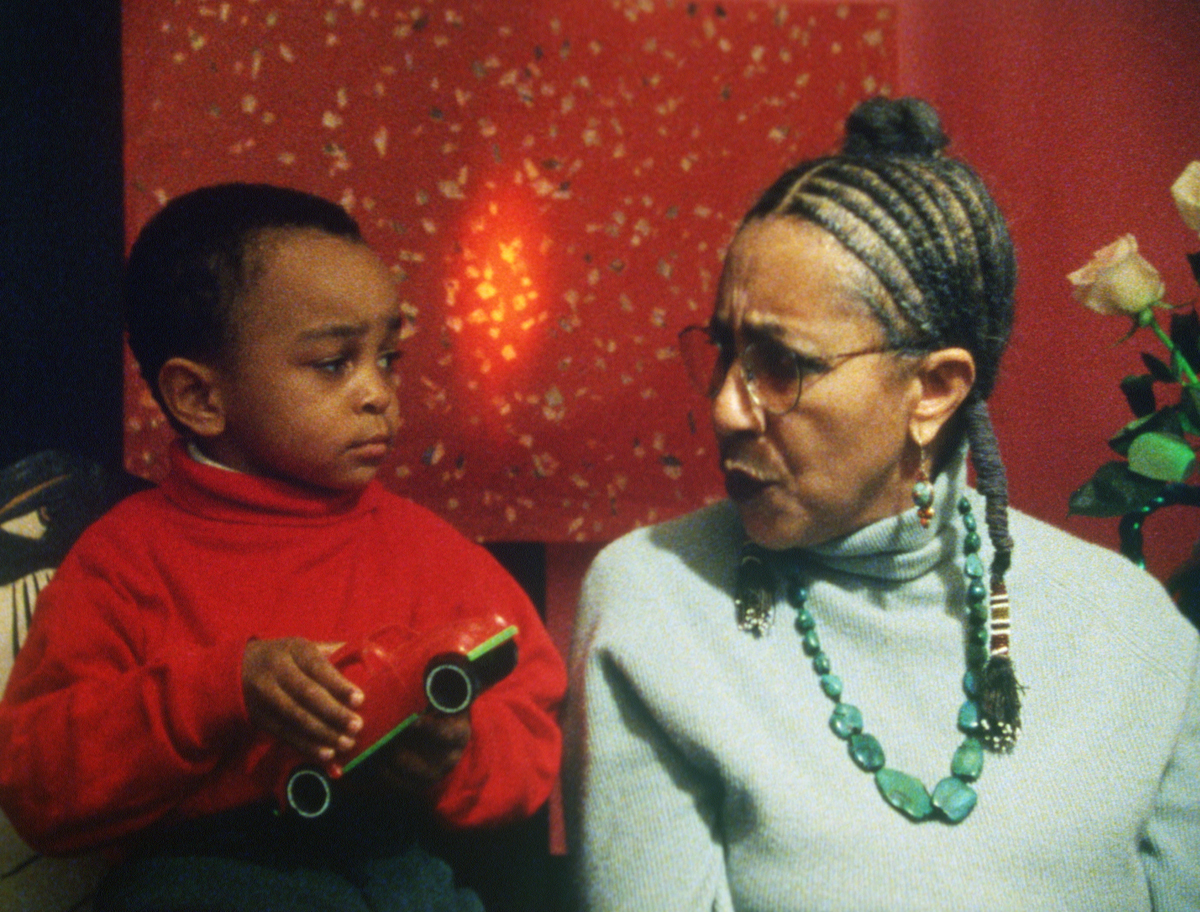 Billops and Hatch share directorial credit on five of their six films; the short Take Your Bags (1998), for which she is the sole auteur, finds Billops wryly riffing on slavery and cultural theft to an exceptionally attentive little boy, a distant relative of hers. Despite this joint authorship, Billops was the catalyst behind many of their works, which often draw upon her own family’s history and frequently feature her—a vivacious figure with elaborate eye maquillage and a strip of hair above her upper lip—in front of the camera. Suzanne, Suzanne (1982), their first film, centers on Billops’s niece, who matter-of-factly recounts her past heroin addiction, her multiple arrests, and the merciless physical abuse she endured from her father, dead since 1968. Suzanne is not the only one interviewed; Billops extends her inquiry to Suzanne’s older brother, Michael, and especially to her mother, Billie (Billops’s older sister), who recalls the “relief” she felt after her husband died but who had done little to stop him from beating their child. In this gutting film’s most wrenching segment, shot in high-contrast black-and-white, mother and daughter take part in a restorative-justice tableau: Suzanne, in the foreground, with her eyes cast downward, calmly asks her mom why she didn’t intervene—an interrogation that causes Billie, seated directly behind her child, to break down into a very real torrent of tears. (Two decades after this inaugural effort, Billops and Hatch would turn their attention to the respective sons of Michael and Suzanne in A String of Pearls, investigating how these now twentysomething men approached the responsibilities of young fatherhood.)