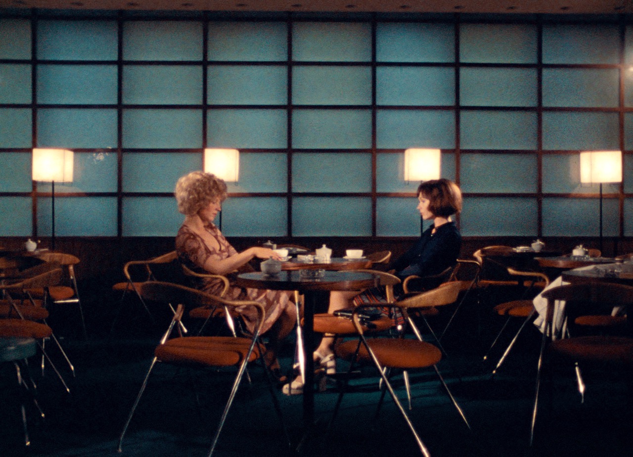 And speaking of mirrors, those glass surfaces so beloved by Fassbinder (as they were by his polestar, Douglas Sirk, whose luxuriantly hued 1950s melodramas provided a template that RWF tweaked with a more austere color palette and Brechtian distanciation) abound in Eight Hours; at one point, Jochen, after a bender at his favorite bar, walks into his own reflection. Mirrors are just one key element of Fassbinder’s typically impeccable mise-en-scène—compositions, like the arrangement of Marion and Monika in a café, that highlight the empathy (and occasional antipathy) provoked by each member of this fascinating constellation of characters.