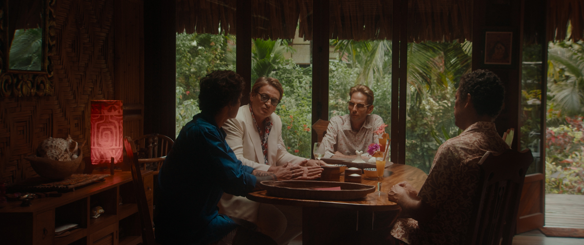 Magimel is perhaps best known in the US for Michael Haneke’s The Piano Teacher (2001), in which he plays the besotted, twentyish pupil of Isabelle Huppert’s Schubert-worshipping, floridly masochistic maestra. More than two decades later, that handsome, youthful face can still be caught in flashes—but the actor now possesses a ruined, dissolute beauty, an ungainly frame. Save for that Jet Ski scene, Magimel executes nothing that remotely resembles a stunt; most of De Roller’s actions are confined to sitting, standing, and shaking hands. Yet his is a very physical performance nonetheless. The actor deftly utilizes his body, marked by the ravages (and avoirdupois) that often accompany middle age, to underscore De Roller’s pathetic political peacocking. Watching the rehearsal of an Indigenous dance meant to emulate a cockfight, for instance, De Roller gradually relaxes his arms, tightly folded across his chest, to make clumsy hand gestures and strut awkwardly along the sidelines. However peripheral, his movements recall the appalling gyrations of William and Kate (and scores of British royals before them) as they cavort with the locals during their visits to Tuvalu, Belize, and other outposts of the Commonwealth.