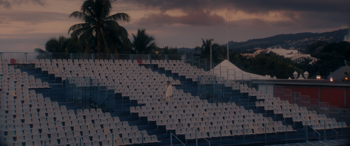 Yet the geopolitics of Pacifiction are not brashly relayed through didactic high dudgeon. Instead, they drift more stealthily via foreboding mood and atmosphere. Discordance abounds. The visual splendor of the islands—the vegetal lushness; the mauve, peach, and lemon hues that dominate crepuscular skies; the infinite blue palette of the water—clashes with the psychic rot hollowing out De Roller and other white residents and visitors, most from the Continent.