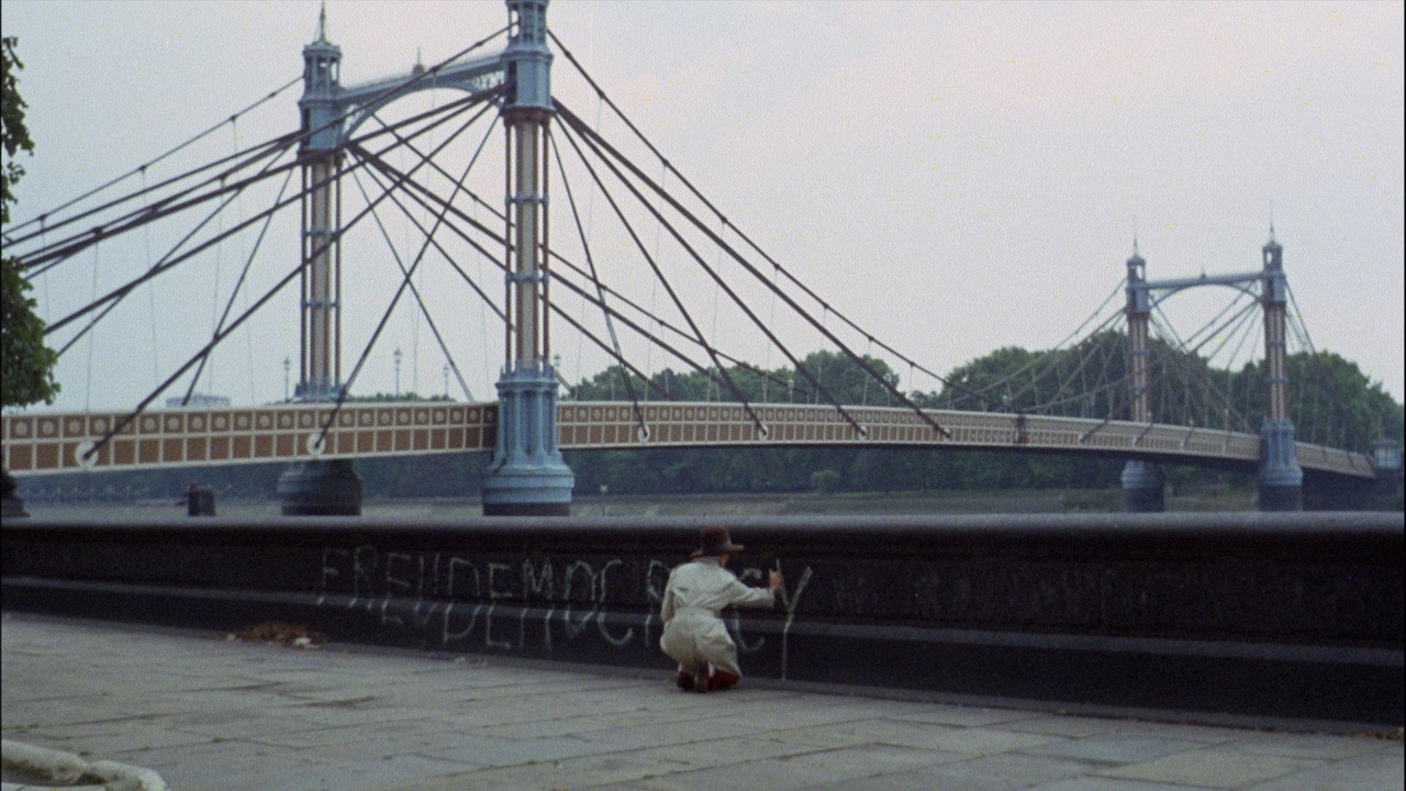 History in the present tense, the Stones’ sulfurous anthem has a gravity and political urgency missing from Godard’s film, despite its strenuous sloganeering. Interlaced with the patient, curious scenes in the Olympic Sound Studios are several agitprop skits, motifs of varying degrees of obtuseness. In one, an haut mod, clad all in purple, reads aloud from Mein Kampf in a smutty bookstore; the cramped space also holds two bloodied POWs who affectlessly proclaim, “Peace in Vietnam.” (The Nazi lector is played by Iain Quarrier, the producer who insisted on the name change of JLG’s movie; Godard returned the favor by punching Quarrier during the premiere of Sympathy for the Devil at the London Film Festival in November ’68.) In another thread, black revolutionaries assemble in an auto scrapyard by the Thames. Rifles are tossed from one man to the next; passages from Amiri Baraka and Eldridge Cleaver are recited. The segment is cacophonous and inert. Other sections return to Anne Wiazemsky, the twenty-one-year-old actress then married to Godard: as Eve Democracy, she is seen spray-painting feeble portmanteau mottos (“FREUDEMOCRACY,” “CINEMARXIST”) or giving simple (yet charmingly accented) “yes” or “no” responses to a series of clotted polemical queries by an overweening TV reporter.