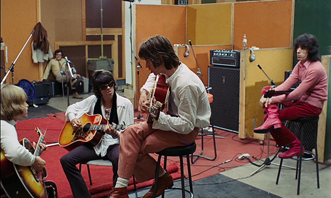 What does cohere, mesmerizingly, in Godard’s disjunctive movie are those segments that trace the evolution of “Sympathy for the Devil,” which would become the first track on Beggars Banquet (1968), the Rolling Stones’ widely praised return to Brit-blues following the tepidly received psychedelic experiment Their Satanic Majesties Request (1967). As captured by Godard, the group’s ode to Lucifer undergoes multiple iterations, transforming from a sluggish, acoustic guitar–heavy number to an indelible, conga-driven samba.