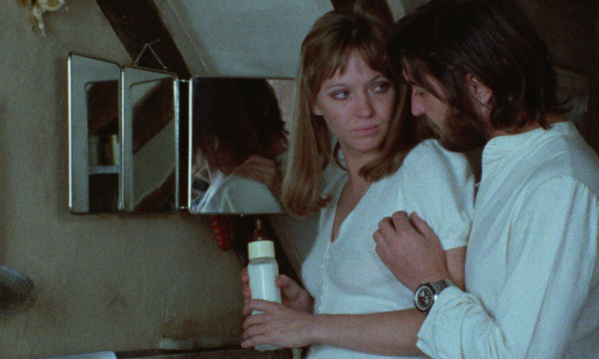 Vivre ensemble was not critically embraced. In her Cannes dispatch for the Village Voice, Molly Haskell wrote, “The film wallows in a Relationship in that oppressive way that is a woman’s sensibility at its worst.” While I don’t entirely disagree with that assessment, especially as it applies to the movie’s desultory final third, I find it much more rewarding to think of Karina’s directorial debut as a kind of gender inverse of another film that premiered at Cannes in ’73: Jean Eustache’s The Mother and the Whore. Like Vivre ensemble, that movie also stars a Nouvelle Vague icon, Jean-Pierre Léaud, as Alexandre, a Parisian dandy (and a clear stand-in for Eustache) in a tumultuous open relationship with a slightly older woman who financially supports him and a nurse devoted to libertinism. Both films showcase attic apartments as key settings, with a particular focus on what happens in and out of the beds that dominate each flat.