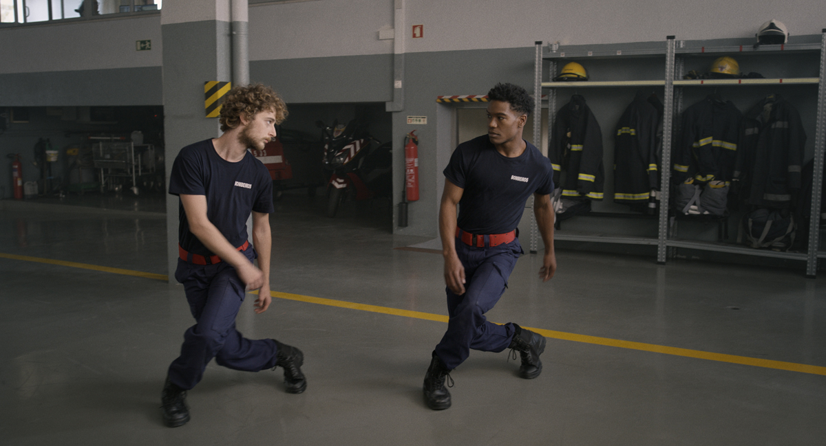 The Commander assigns twink Alfredo to be trained by Afonso (André Cabral), one the station’s few Black members. A spark ignites between the two at first handshake, the attraction deepening during CPR training and an all-squad dance number (equal parts MGM, Pina Bausch, and modern music video) set to an electro-hop track. Responding to an emergency call, the aristo and the prole will consummate their love on a patch of charred landscape. Sex is vital in Rodrigues’s films, but he doesn’t wish to sacralize it, choosing instead to highlight its absurdities: as Alfredo and Afonso hotly jerk each other off, the camera cuts to extreme close-ups of two enormous, obviously silicone dicks.