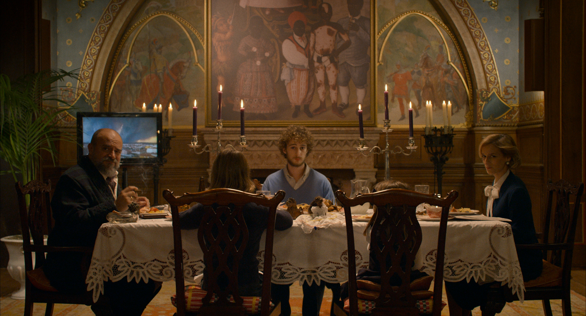 Riskier are the terms the two young men use for each other in their coital and postcoital banter—racial ribbing along the lines of “imperialist” and “Hottentot Venus” (though a few terms are more incendiary). Deftly handled, the provocative exchange in no way derails the film; more important to Rodrigues is subtly calling attention to the grotesqueries of the Luso empire. During Alfredo’s performance of Greta Thunberg’s manifesto in the royal dining room, the camera alights on his parents’ art collection: a clump of baleful paintings and sculptures of “African” and other colonized individuals, the artifacts made all the more repellent when presented against the teenage Swedish activist’s fiery words (“The eyes of all future generations are upon you”).