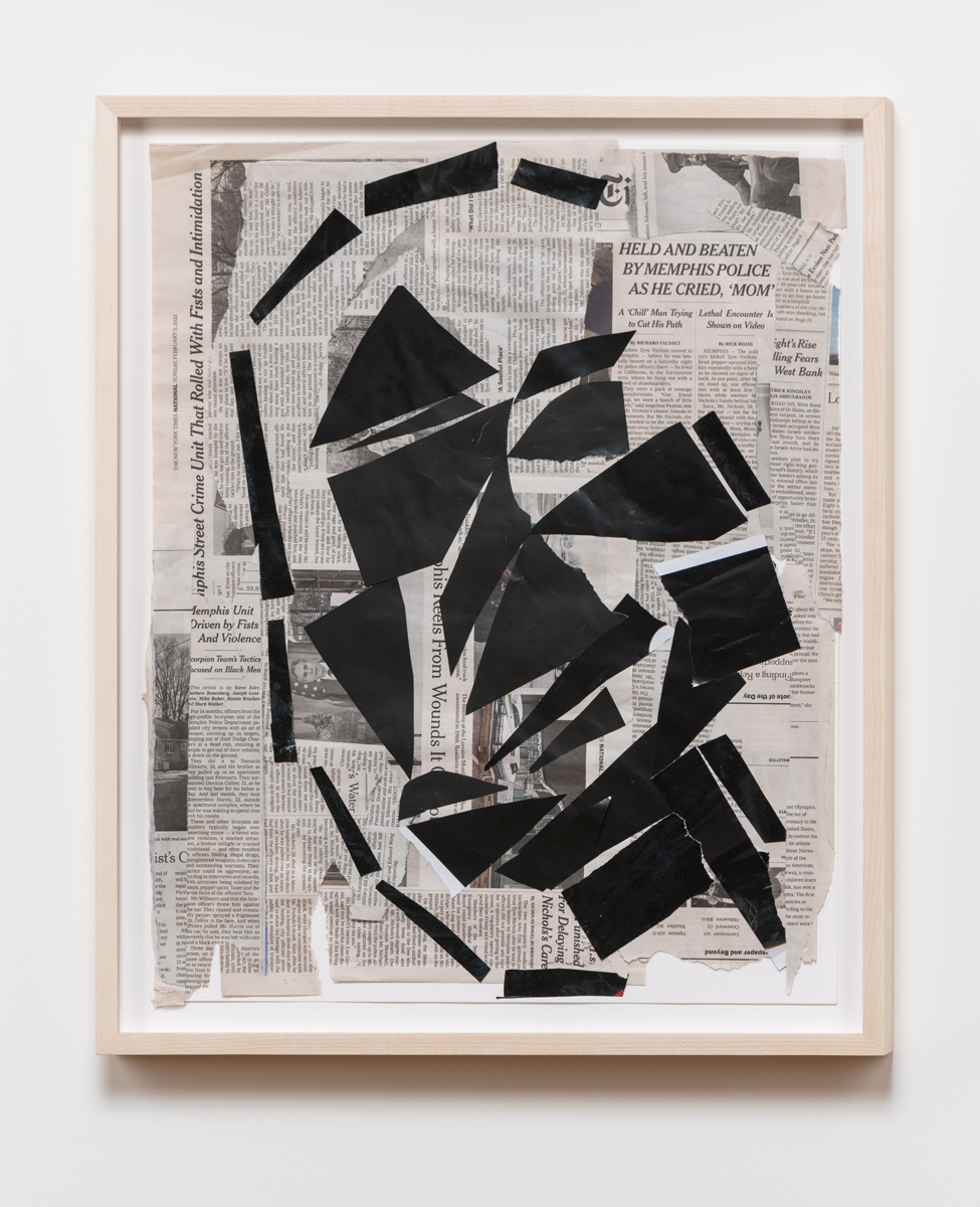 The Rose, installation view. Courtesy the lumber room. Photo: Mario Gallucci. Pictured: Pamela Sneed, Autopsy for Tyre Nichols, 2023. Collage/magazine paper, 20 × 16 inches.