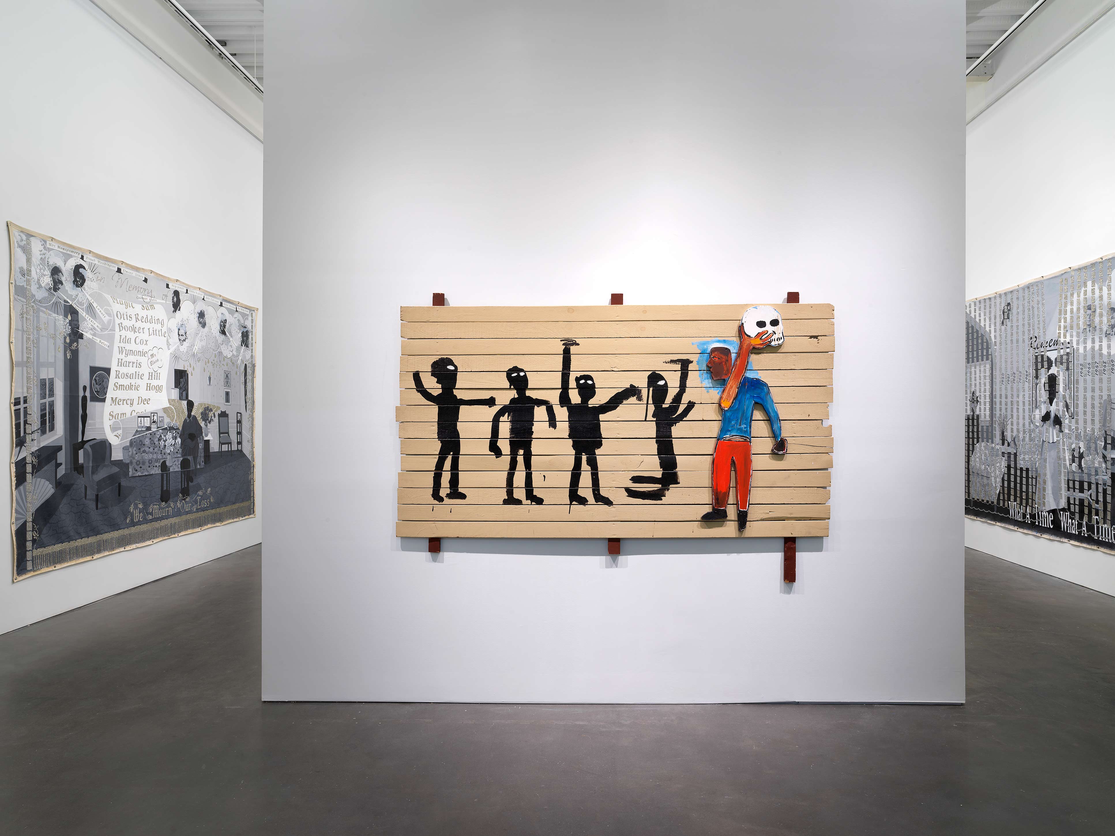 Depression and acceptance are highlighted instead. Theaster Gates’s hypnotic video of a black monastic order of musicians ritually smashing up a ruined church conveys the strange beauty of urban decay, a heartfelt scene whose accidental convergence with gentrification narratives that recast inner-city dilapidation as an edgy urban aesthetic is not exactly the artist’s fault. Exceptions to the exhibition’s somber mood include a series of magnetically on-form Kara Walker drawings and Diamond Stingily’s freestanding doors paired with baseball bats. Walker’s drawings evoke black grievance rather than grief, a tonal shift that emphasizes how little the mournful framework suits her bracing coldness, Stingily’s careful warmth, or even, really, an exhibition that aims to respond robustly to white supremacy.