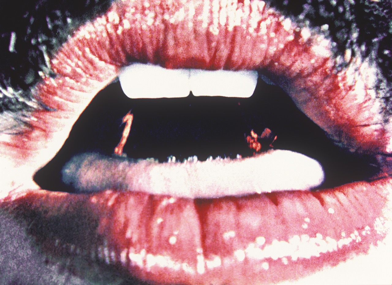 The final gallery, “The Erotic,” with fewer and larger works, is a welcome shift in that it demands little and gives a lot, like Zilia Sánchez’s voluptuous labial abstraction, Lunar V (Moon V, circa 1973), and a projection of Lygia Pape’s luscious Eat Me. In the Brazilian artist’s 1975 film, the camera holds on a series of close-ups of men’s mouths sucking on candy and popsicles—coarse, glossy black facial hair; gleaming red lips; a bright wet pink thrusting tongue. The impact on the hypothalamus is immediate—arousal, disgust, arousal. The intellect will catch up later.