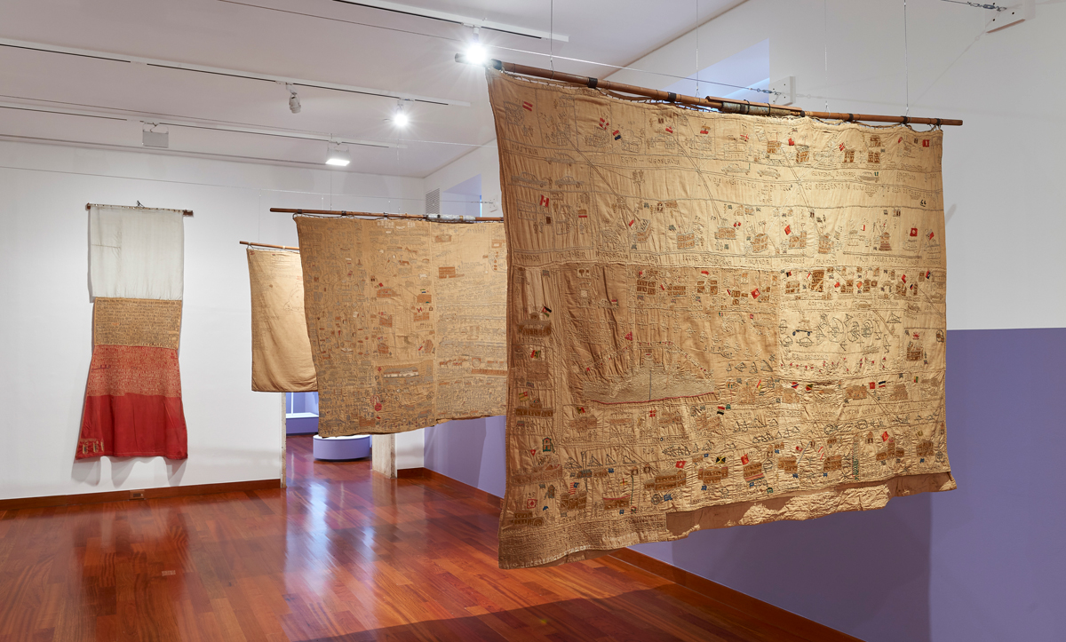 During his years of detention, Bispo constructed dozens of reproductions of objects out of fabric, wood, metal, and cardboard, helpfully labeling them, since their slightly lumpy contours don’t always immediately register: hammer, lamp, paint roller, compass. He was riveted by tasks of archiving and understood that cataloging can be effective via text as well as image: banners list everyone he ever met and every name that starts with the letter A, while others are schematically drawn compendia of navy ships or aerial-view maps of the countryside and the nation. Many of them hint at the world outside the walls of Bispo’s cell, a world he accessed through the newspapers that he regularly consulted; for example, they were the source for a series of Miss Universe sashes that are the same scale as actual pageant finery but are crowded with idiosyncratic geographical elements. Bispo’s embroidery, though elaborately detailed and deftly executed, is composed of relatively simple stitches that evidence countless hours of minute, hand-cramping labor. Some of the blankets have stains or are stamped with the name of the hospital; when on display at the 1995 Venice Biennale, the garments he had worn as daily uniforms were so odiferous that they had to be laundered.