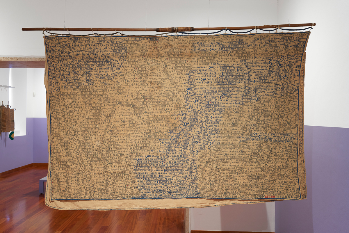 In the exhibition’s opening room, a sampling of photos, garments, and documents emphasizes the exuberant scope of Bispo’s all-encompassing project as well as the physical confinement he was constantly negotiating. His fringed, ritualistic “annunciation cloak,” to be worn when he presented himself to God, is lined with the names of women who would accompany him on this journey. Nearby, his hospital ID card shows him squinting (from the sun? the bright flash of the camera?) next to typed words classifying him as both indigent and paranoid schizophrenic—a diagnosis fraught with starkly racialized implications, notes Jonathan Metzl in his book The Protest Psychosis: How Schizophrenia became a Black Disease. Though Metzl was writing about histories of mental hospitals in the United States, his observations extend to the Brazilian context, where descendants of enslaved Africans, such as Bispo, comprise a majority of those held in carceral facilities that corral people experiencing homelessness and mental illness.