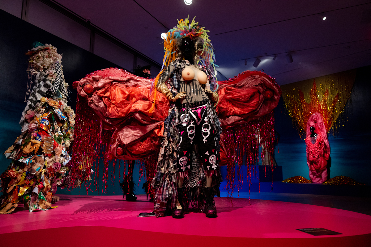 Queer Maximalism × Machine Dazzle, installation view. Courtesy the Museum of Arts and Design. Photo: Jenna Bascom. Pictured: Machine Dazzle, costume from Decade 23: 1996–2006–Songs Popular with Radical Lesbians, 2016–present, featured in Taylor Mac’s A 24-Decade History of Popular Music.