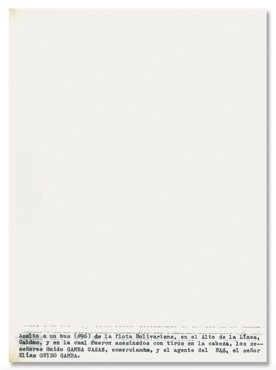 Johanna Calle, Pie de fotos (1 of a series of 18), 2012. Typewritten text on gelatin silver print. Courtesy Toluca Fine Art and Galería Casas Riegner. © Archivos Pérez & Calle.