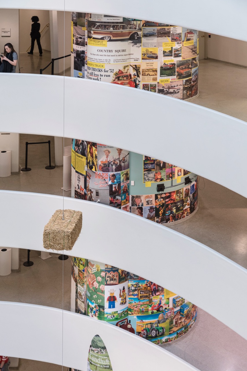 Slogans and queries unfurl along the insides and undersides of the Guggenheim’s spirals, exacerbating the dizziness and vertigo that one habitually experiences at the institution. In the atrium, underneath the bottommost ramp, a visitor reads the following prompt: “the countryside is where our largest threat—warming—is most visible.” I’m troubled that the exhibition does not follow through on the central observation made here: the braided fates of the urban and the rural are of key significance to the multiplied and overlapping perils of the climate crisis. While glancingly recognized, it seems unconscionable not to have put this ever-expanding global menace more forcefully at the core of inquiry.