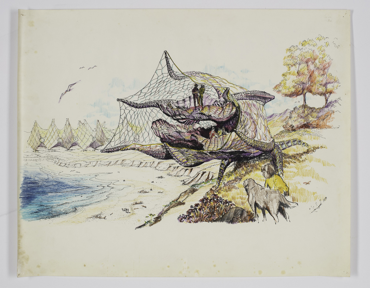 Glen Small, Biomorphic Biosphere. Project. Drawing of a flying house, 1973. Pen and watercolor on paper, 19 × 24 inches. Courtesy Museum of Modern Art.