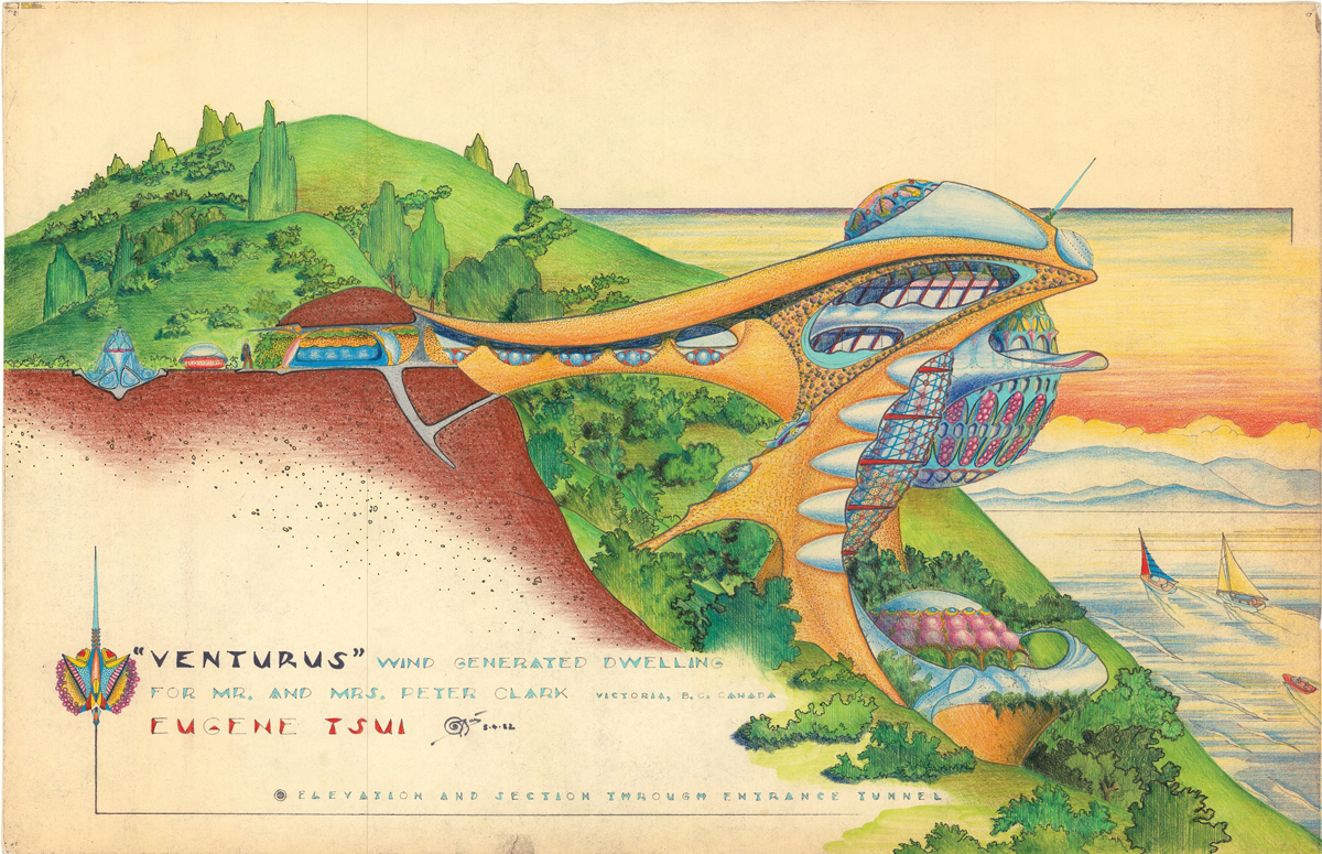 Eugene Tssui, Venturus, wind-generated dwelling for Mr. and Mrs. Peter Cook, Victoria, BC, Canada, 1982. Watercolor, Prismacolor pencil, pastel chalk, and colored ink on paper, 21 × 32 inches. Courtesy Collection Eugene Tssui.