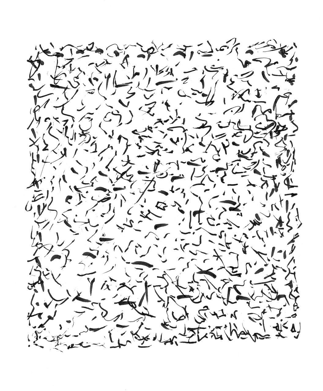 This opposition enfolds a second more fundamental paradox: her unreadable graphisms present themselves as artifacts of reading. She made books, postcards, newspapers, letters, texts, informational bulletins, texts for signboards, explanatory posters, written pages, comic strips, stories. These are the names they were given, but, I reiterate, none of them can be read, even when the stroke used in each resembles a written character. To those formats we must add one that is especially eccentric within the exquisite, discreet extravagance of her graphisms: “public readings”—sheets of paper on which one or several marks expand a figuration of the spoken word embodied in great storm clouds of suspended calligraphy.