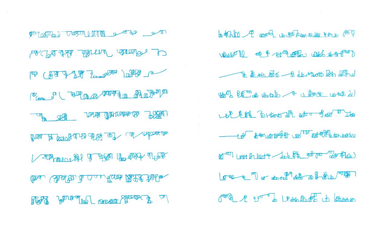 Mirtha Dermisache, spread from Sin título (Libro), 1971. Unique artist’s book, ink on paper, bound in black hardcover, 48 pages with 36 images, 11.8 × 10.6 inches. From Mirtha Dermisache: Selected Writings. Image courtesy the Mirtha Dermisache Archive.