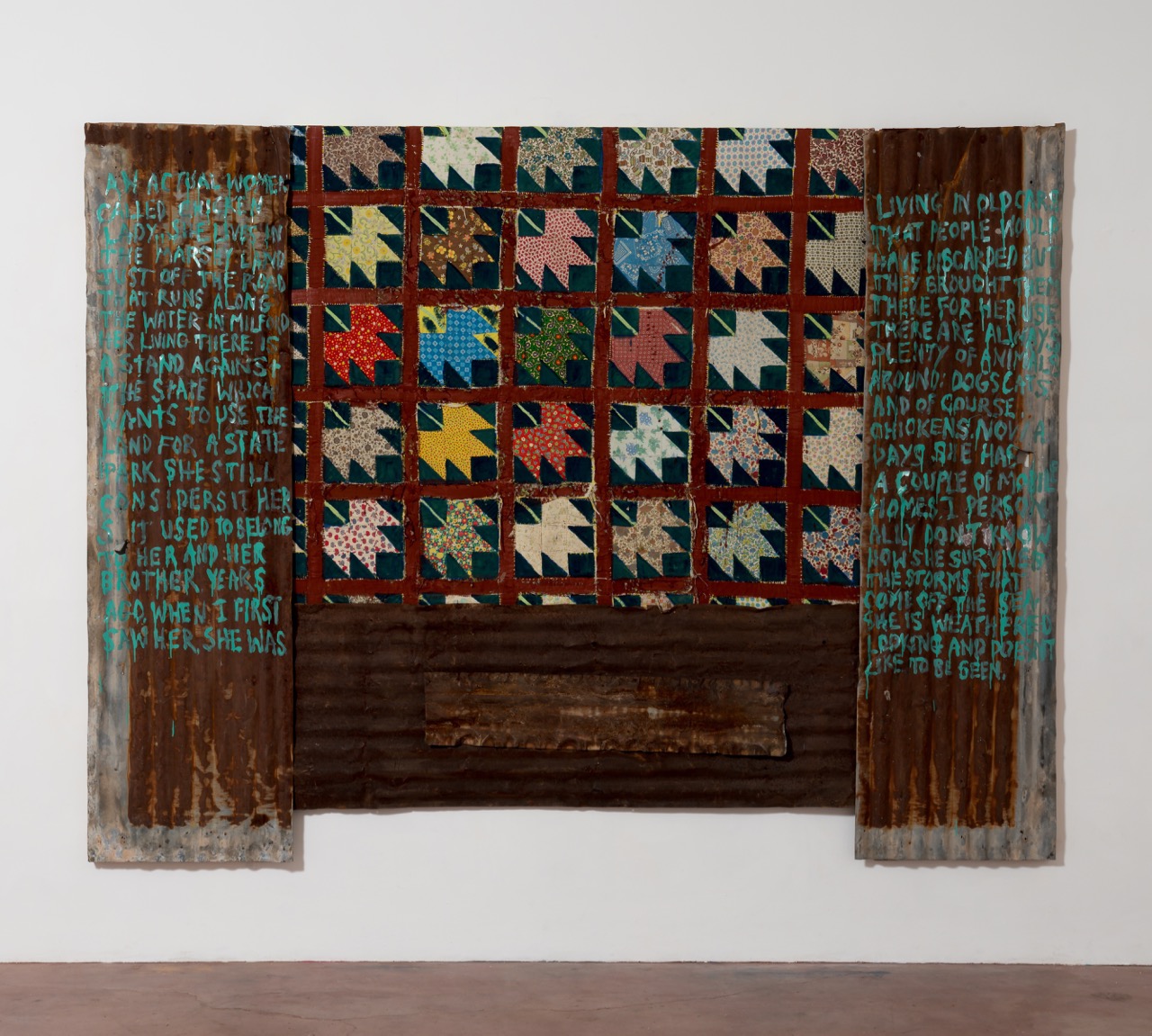 Harmony Hammond, Chicken Lady, 1989. Quilt, canvas, acrylic, oil paint, corrugated roofing tin (3 panels), 96 × 127 ½ inches overall. Image courtesy the artist and Alexander Gray Associates. © 2018 Harmony Hammond / Licensed by VAGA at Artists Rights Society. Photo: Eric Swanson.