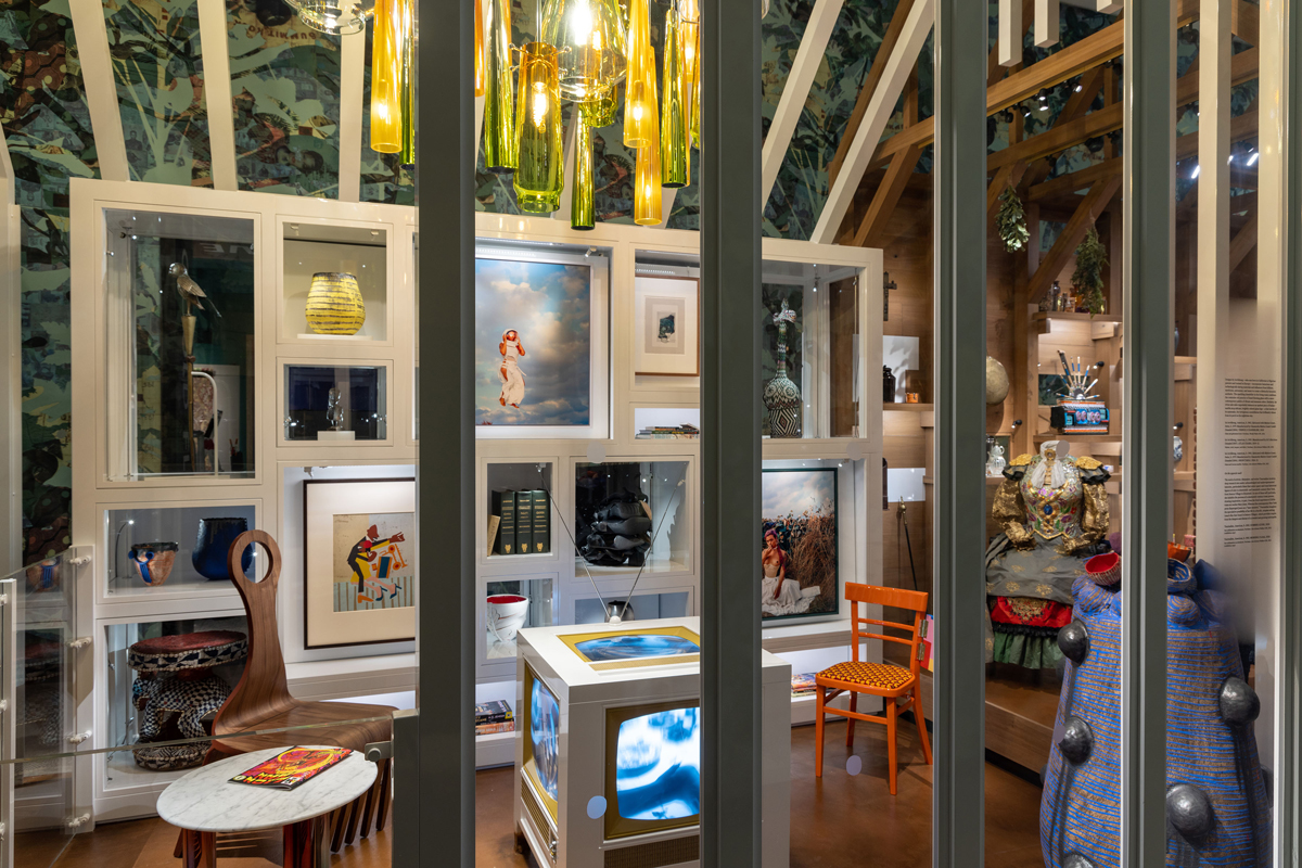 Before Yesterday We Could Fly: An Afrofuturist Period Room is a house-within-a-room located just off the Metropolitan Museum of Art’s Medieval hall. There are more than forty other period rooms on display at the Met, all of them immersive spaces that one can step into or stand on the threshold of. In contrast, viewers surround Before Yesterday, experiencing it by circling a narrow perimeter corridor, peering into the freestanding house through cutouts in its façade. Design objects, home furnishings, books, herbs, and artworks fill its deconstructed interior.