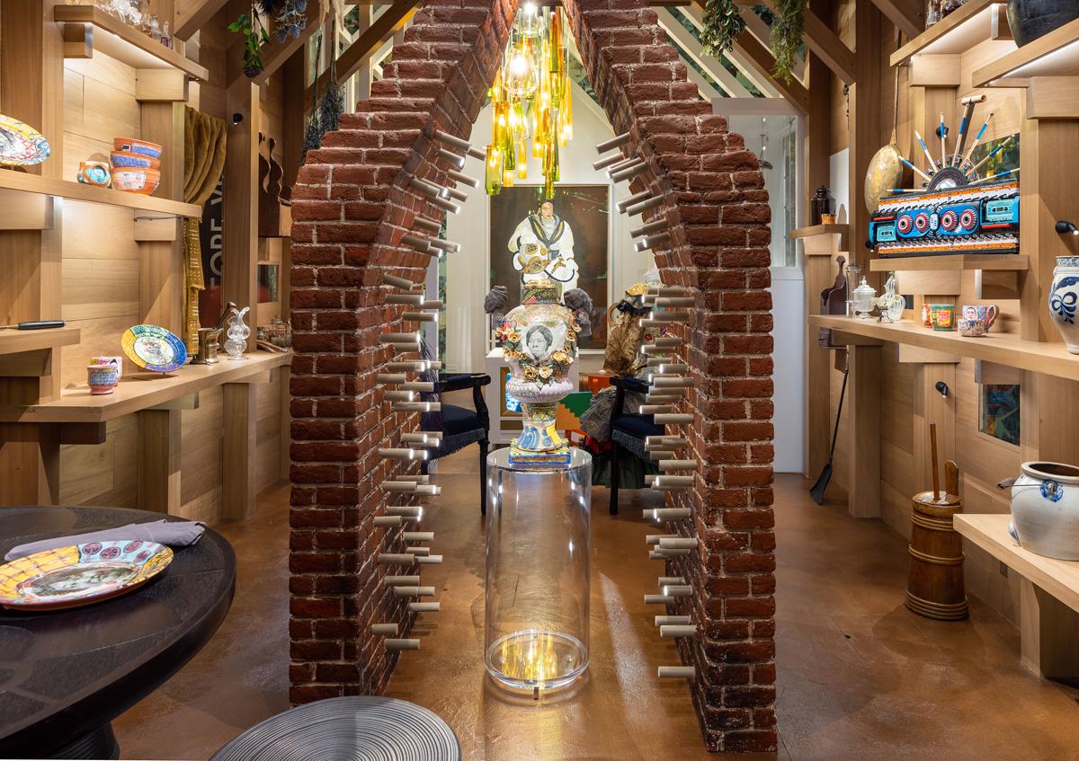 Wall text refines the scenario: “The imagined residents of this home used their knowledge of technology, science, and magic to develop a means of time travel, which has allowed them to gather works of art from across time and space.” People living in the social, economic, and geographic outskirts of the city unlock the secret of time travel then use this enormous power to . . . collect art? That said, collecting and selling go hand-in-hand. While we are told this is an imagined collection, the exhibition design actually resembles a (closed) gift shop. The Martin Luther King ashtray, Beyoncé plate, Frederick Douglass cup, and twenty other ceramic objects emblazoned with pop icon line drawings by Lugo cement this impression.
