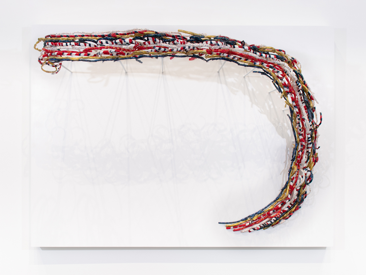 Pamela Council, Flo Jo World Record Nails, 2012–21. 2,000 acrylic fake fingernails, nail polish, rhinestones, metal, wood, 22 × 60 × 40 inches. Courtesy the artist and Denny Dimin Gallery.