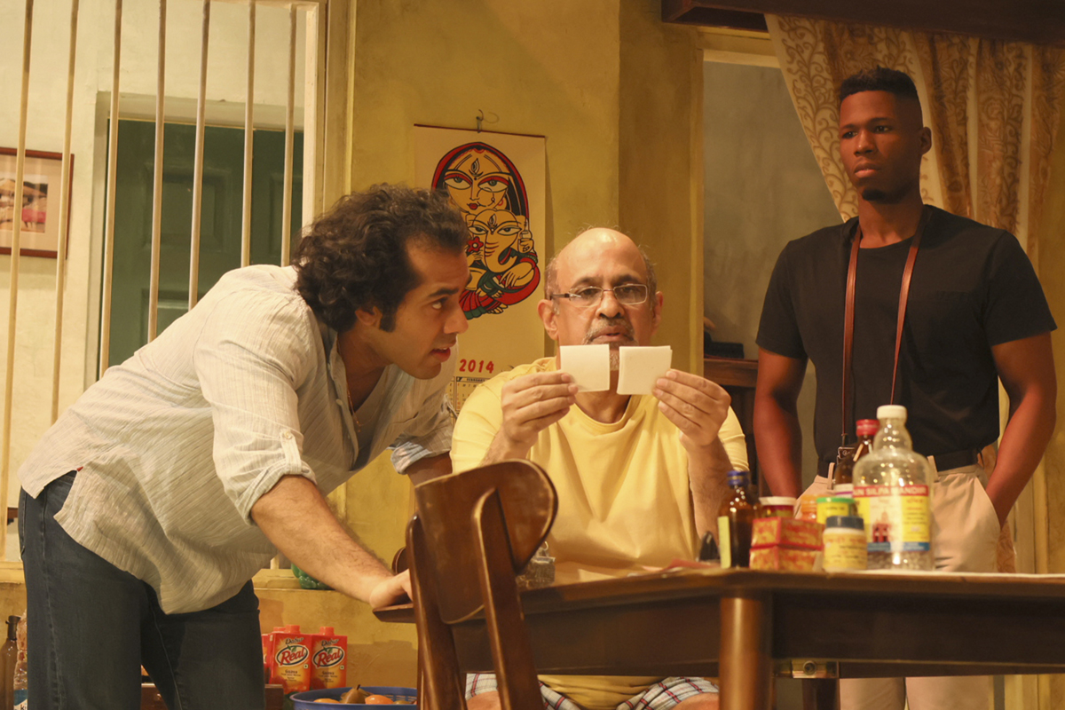 In fact, what first welcomes the eye is a screen. A fabric scrim, on which movies and text appear, covers the apartment of Pishimoni (Gargi Mukherjee) and her husband, Pishe (Debashis Roy Chowdhury), where nephew Choton (Abrar Haque) and boyfriend Raheem (Jakeem Dante Powell) are staying during their trip. Peiyi Wong’s scenic design of a scruffy but cheerful and light-filled duplex resembles the one from the smaller Soho Rep (by the dots collective), as both sets are based on the author’s family home in India. A brief filmed prologue dollies along the busy streets of Kolkata as bold, jumbo credits in Bangla and English trumpet the play’s title and cast members with a wink (home movies via Bollywood). The camera leads us to a building, down an alleyway, up a flight of stairs, and, as the membrane lifts away, into the home, where most of the action takes place.