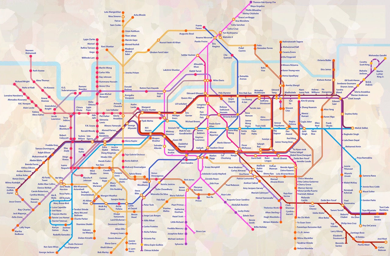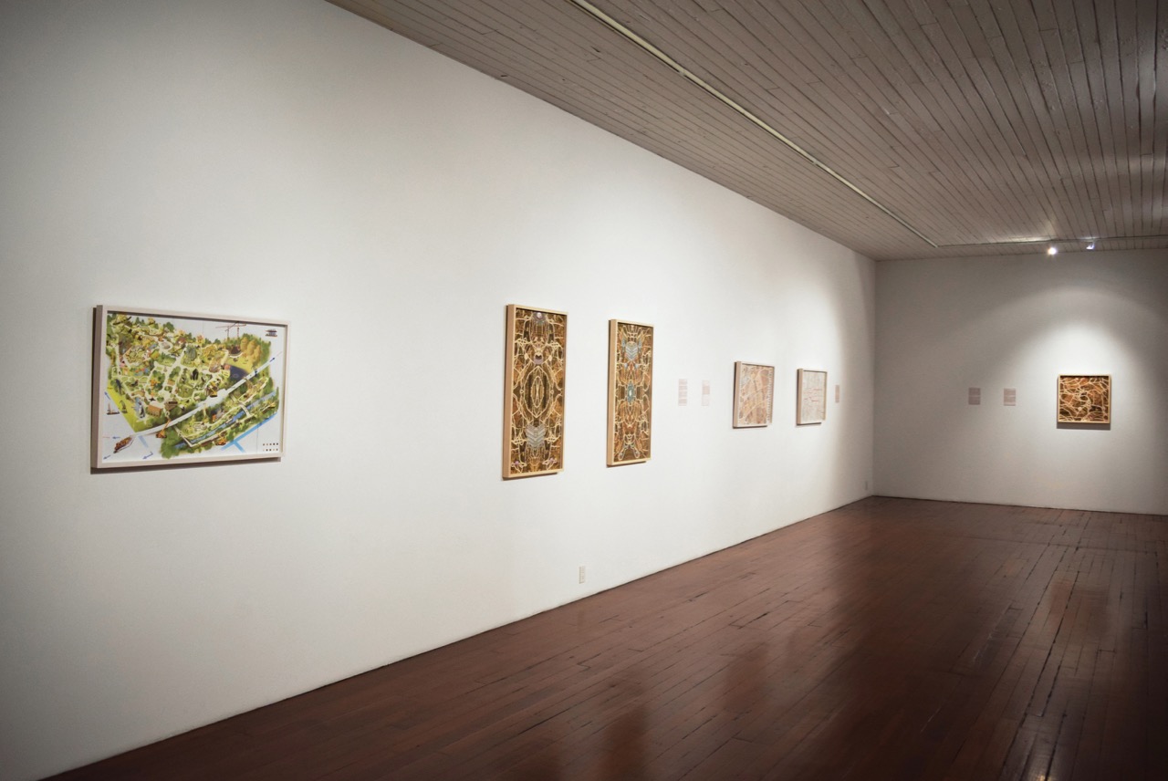 But deSouza’s intervention is not simply one of reversing the colonialist’s gaze, as the accompanying images on view make clear. No travel account would be complete without maps and diagrams, of course, but what is distinctive about these visuals is the way in which London is remade in the image of empire; its history of colonial oppression reshapes—deforms, even—the very fabric of the city that was once the center of global political and economic power. In a plan of the London Zoo (one that is still in use today at the site), animal habitats and tourist facilities are relabeled with the spoils of imperialism, both material—“gold,” “slaves,” “silk,” “tobacco”—and the fantasies of colonial world that resulted—“happy families,” “adventure,” “paradise”: a favorite city attraction is revealed to be a product of British plunder. A classic London Tube map shows stops renamed in honor of postcolonial writers, theorists, musicians, and artists. A pair of images—both titled Mzungu, a Bantu word meaning “white person” and “traveler”—consist of manipulated maps overlaid by images of the crown jewels. Some roads and byways are picked out in a pale yellow that coalesces into abstracted figures. Between that and the placement of the jewels, the city is suddenly transformed into an African body, a subtle haunting of London by its colonial past.