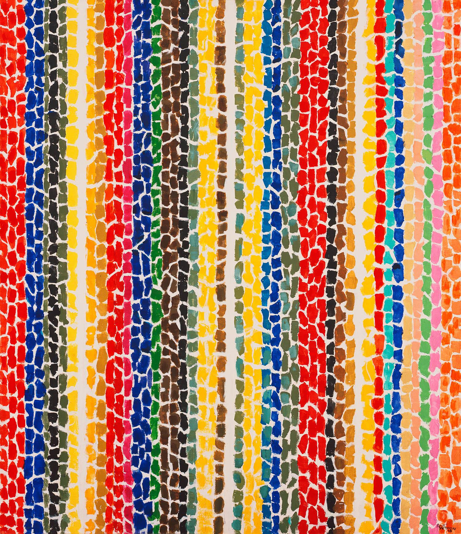 Like her Washington Color School peers, Thomas was devoted to abstraction and animated by color. Following their patron saint, Helen Frankenthaler, Louis and Noland aimed to fuse pigment and canvas so that the picture became an uninterrupted, wholly two-dimensional surface, more akin to dyed fabric than anything. Thomas, for her part, was perfectly okay with the slightly sculptural appearance produced when she touched her loaded brush to the smooth white canvas. In fact, her brushstrokes seem to dance and flicker in front of the support rather than being fused to it.