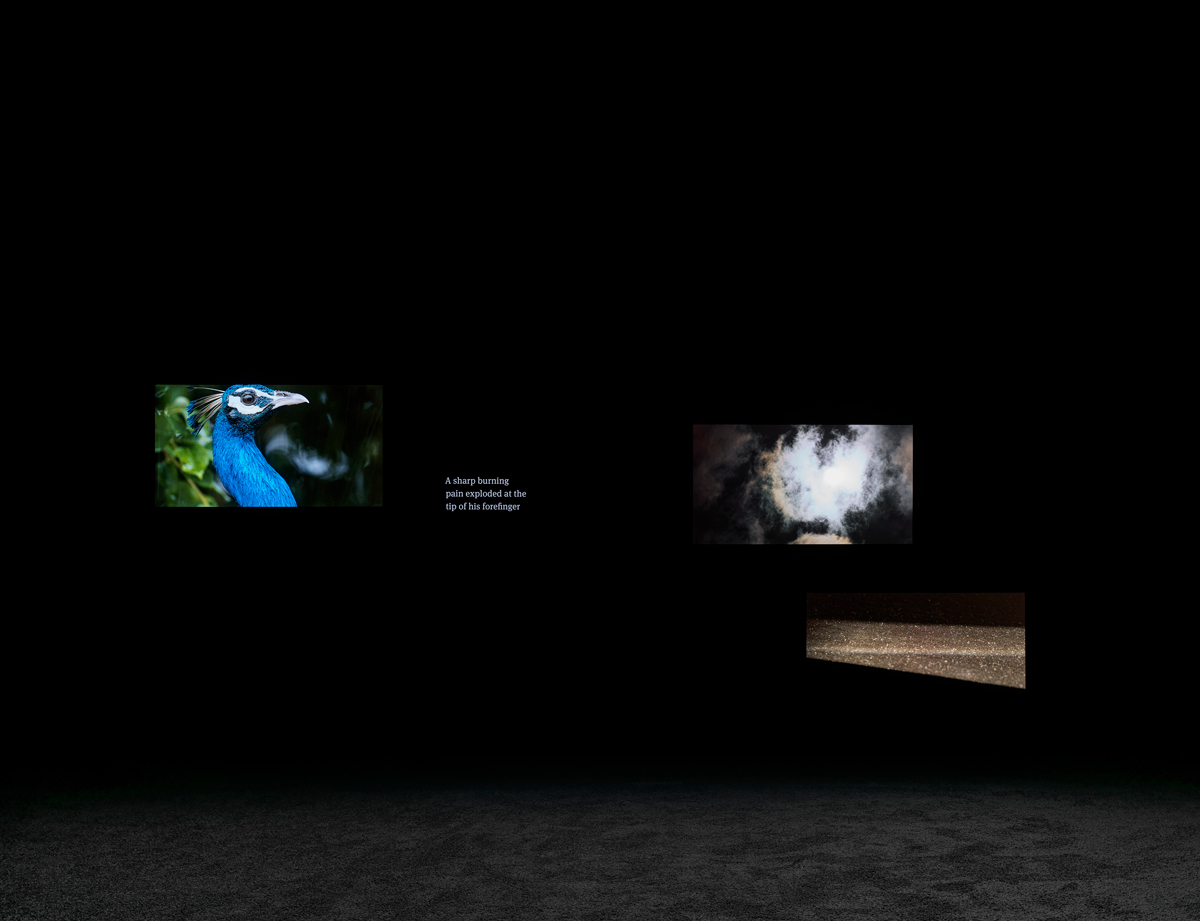 The result is less an origin story than a lyrical mapping of our current state of affairs—though a fragmented, collaged one. Rather than tracing a single, if elusive, narrative, as many of his past film-based projects have, The Peacock’s Graveyard is organized around a series of episodes named for their protagonists: The Priest, The Hangman, The Landlord, The President, and Pabu Holla (a pair of friends). Written by the artist, the stories are adapted from ancient Indian folklore and more modern parables, some imagined or reimagined, and distilled into short stanzas. The text is projected on the wall of an inky black room, synchronized with images that appear and disappear elsewhere on the wall at a studied pace. Other than some archival footage drawn from old Indian movies at the beginning—of a ship on stormy seas and torrential rains, fitting symbols for the world we find ourselves in now—Kanwar shot everything else: nonhuman entities (with one or two exceptions), including flora, fauna, the natural elements, the sky and the earth, an ashtray, and so on.