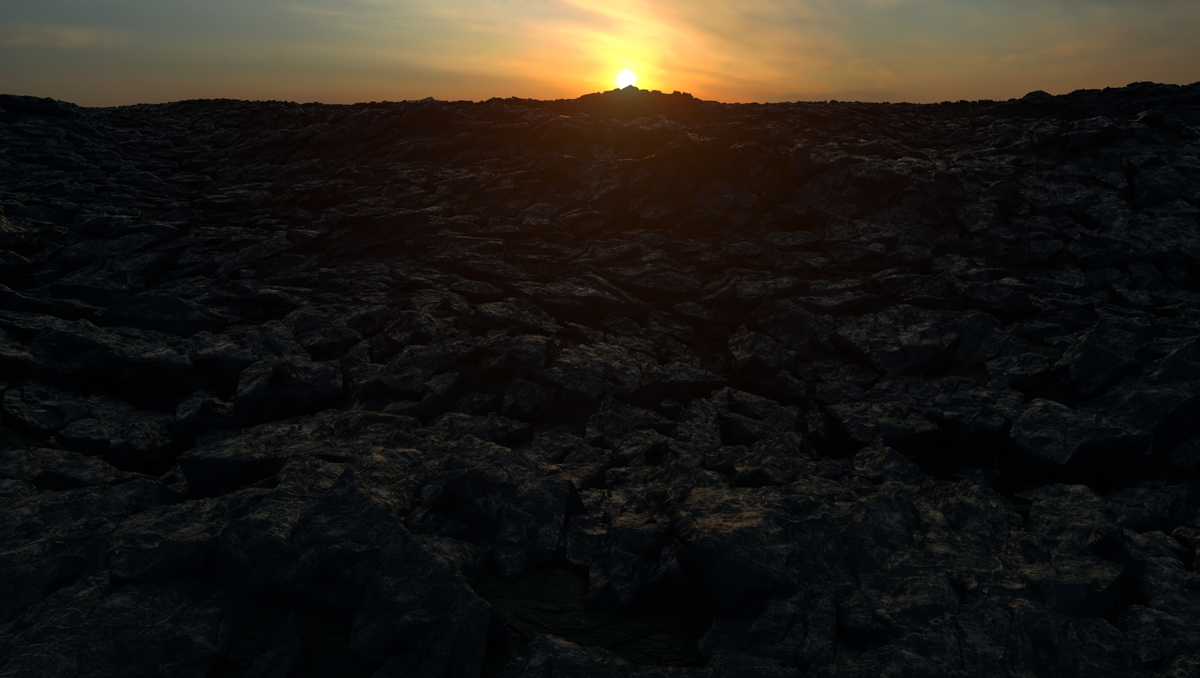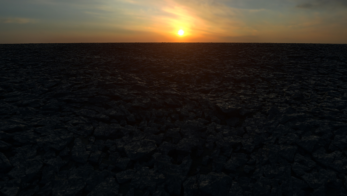 A sea roils. But it’s not quite a sea. It’s more viscous than that: tarry like crude oil. Filled with blackened clumps and fragments that resemble chunks of asphalt, it exists in a state between liquid and solid, like half-cooled magma. It’s not quite a sea, too, because it doesn’t have the smooth energy of waves. On the one hand, it’s organic, akin to a surface of reptilian scales shifting as they move; on the other, it feels mechanical, rising and falling as if a million hydraulic lifts are repositioning a million pieces of . . . stuff. But even the nebulous term stuff feels wrong: it doesn’t convey the simultaneously visceral and immaterial quality of what we see. Waves continue without end, but occasionally—jarringly—they reverse for a moment. Above the horizon, a sun hovers; the sky changes from a gaseous yellow haze to a crystalline, bluish white. These color shifts are not enough to tell us if it is dawn or dusk, though—time makes no sense here. We could be looking at the earth being formed, eons ago, or at the aftermath of an all-too-imminent ecological disaster—a postapocalyptic, even post-human world in which life means something very different than what we imagine it now to be.