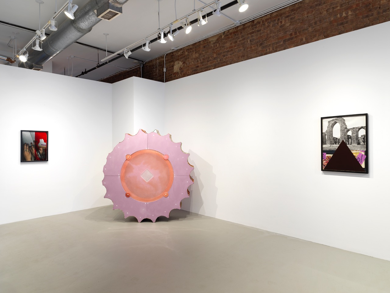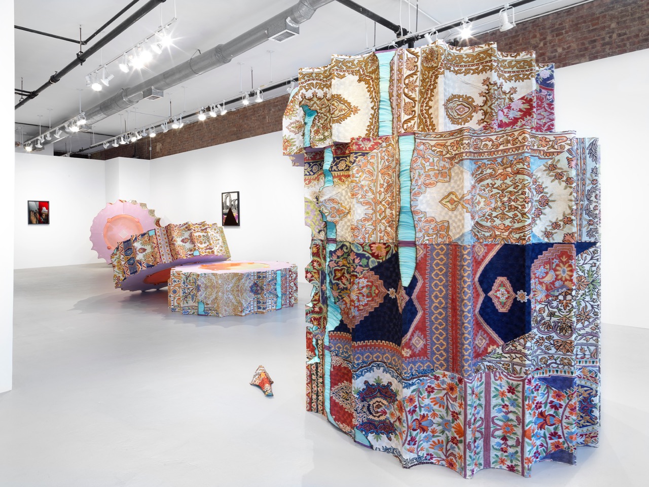 Though laid low in Khan’s refashioning, these pillars are not ruins so much as reclamations, thanks to the skin that’s been applied to their surfaces—handwoven Kashmiri rugs, collaged together so that their geometries and palettes clash and morph as they wind their way around their supports. The wrapping reflects a common practice in mosques, where carpets are used to obscure the architecture of repurposed buildings, including columns—a process of claiming space that attempts to leave behind what came before, a form of renewal that is also a veiling of the past. (These acts of architectural détournement are sometimes dramatic, as with the Masjid Malcolm Shabazz in Harlem, which was originally built as a casino and which Khan cites as a reference.) The carpets were commissioned by the artist from Kashmiri artisans, with whom she worked closely to achieve her designs; after India’s deeply anti-Islamic Modi government rescinded Kashmir’s status as an autonomous territory in August, putting the region’s Muslim population under a strict curfew, closing borders, and imposing a media blackout, the weavings had to be smuggled out—a covert operation, art as contraband.