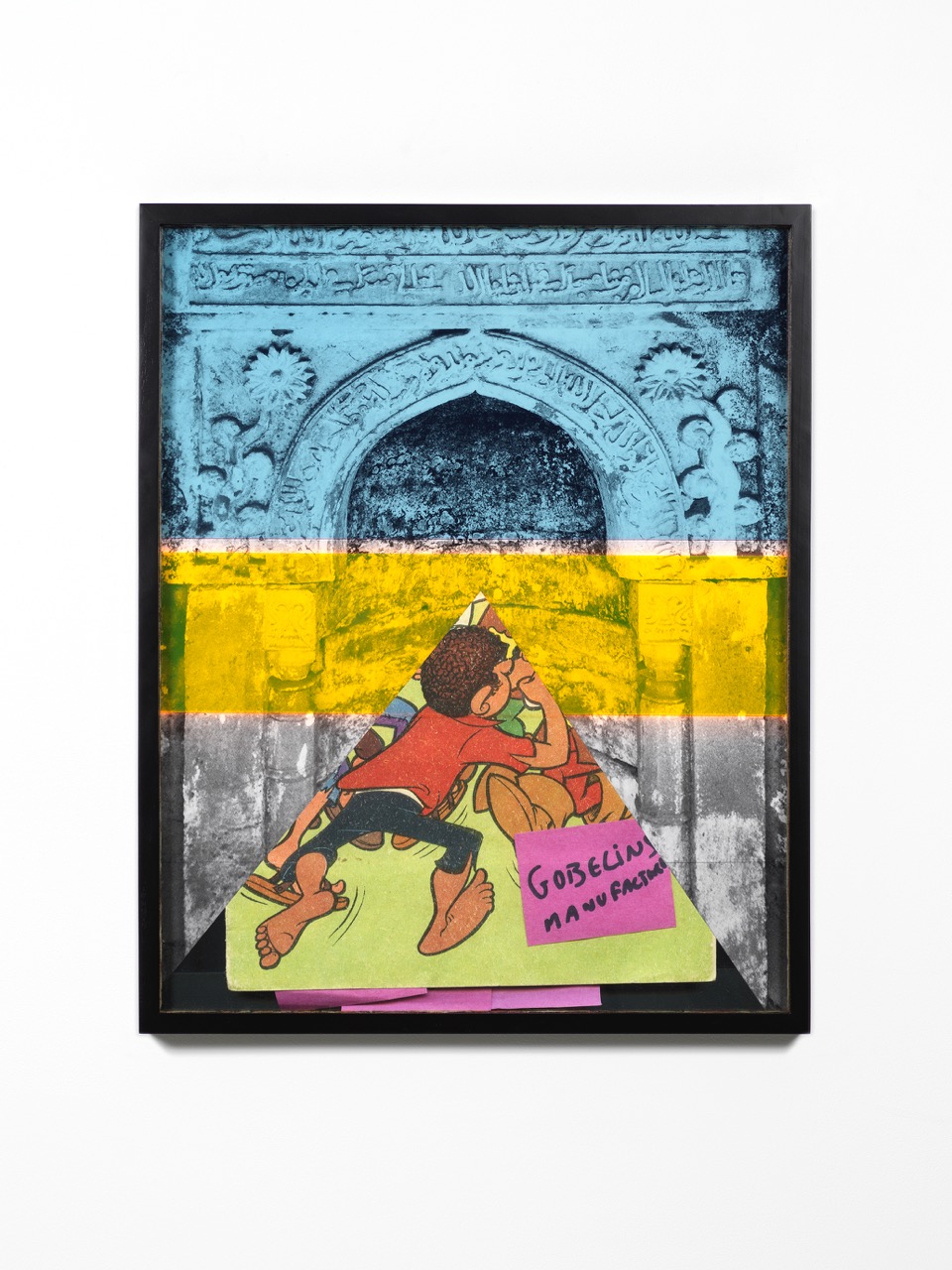 In these prints, Khan juxtaposes the cartoons with other images—views of a devastated mosque, some tumbled Roman columns, handwritten pink Post-it notes, marked-up pages from Arundhati Roy’s The End of Imagination, and so on. While Roy’s pages, visible in the panel Censored Hands, speak of the rise of violence against India’s Muslim minority under Modi’s rule, first as chief minister of Gujarat and then as prime minister of the whole country, Khan is careful to have chosen for two other works (Baarwaada, the Oldest Walk and 27 Jain) images, on the one hand, of one of the world’s longest extant mosques, sited in Gujarat and now in a grave state of disrepair, and on the other, the Quwwat ul-Islam mosque in Delhi. The former survives against the odds, while the latter was built on top of, and at the expense of, twenty-seven Jain temples—an act of cultural assertion that is simultaneously an act of erasure. There is no uncomplicated innocence to be found here, no form—yet—of liberation that makes everybody free.