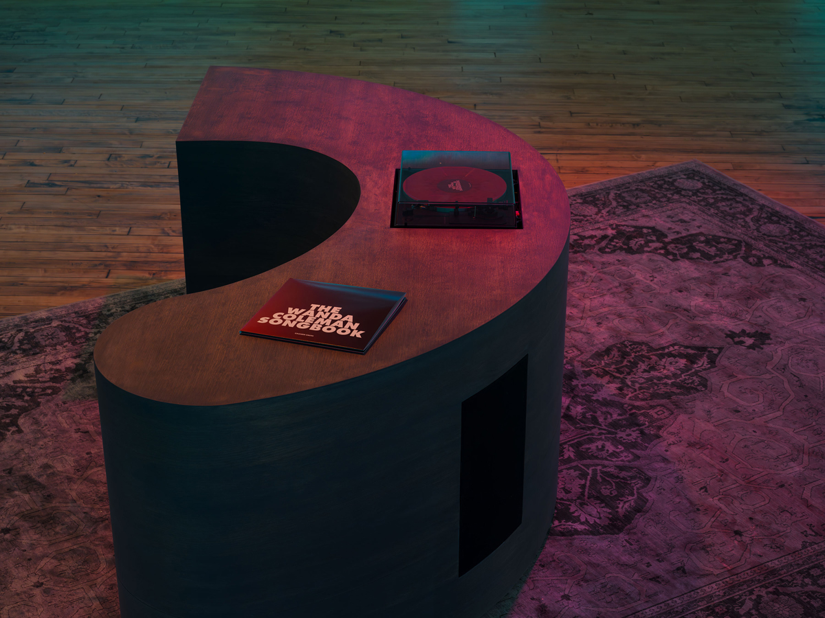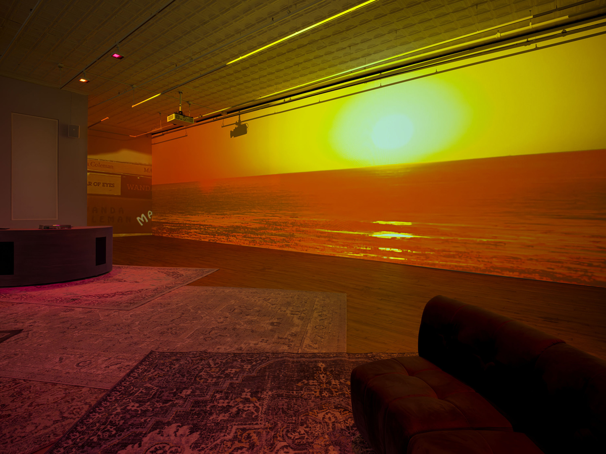 With The Wanda Coleman Songbook, the installation at the center of Cauleen Smith’s latest New York solo show, the artist has transformed 52 Walker into the ideal space for deep listening and slow looking. The floor is covered with worn carpets, the lighting is dim, warm, and inviting, and the couches are remarkably comfortable. It’s a place where you feel like shedding your coat, plopping down your bags, and settling in. Drop the needle on a thirty-two-minute vinyl on the minimalist DJ table, watch the videos projected all around you, take in the scent wafting through the gallery (a mix of grass, eucalyptus, gasoline, ocean salt, flowers, and citrus, from what I could sniff), and find yourself immersed in Smith’s vision of Los Angeles.