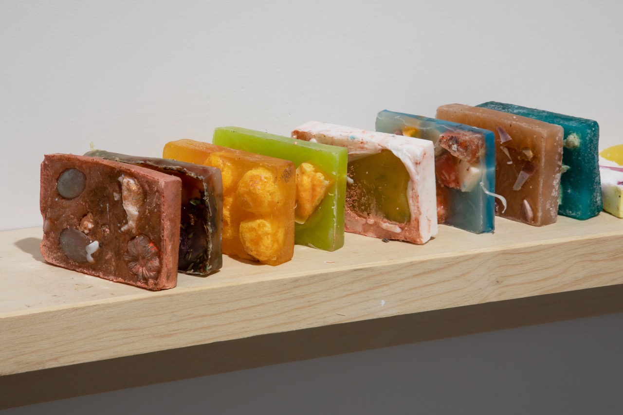 Ms. Harris’s well-manicured fingers range over her bathroom countertop, strewn with all manner of what are clearly handmade beauty tools, devices, vials, and potions; those same objects are on display in the gallery, arranged artfully on stylish wooden plinths, juxtaposed with flowers and plants as in a luxe boutique. (A second room includes an array of soaps lined up on a wall shelf and several collages derived from the pages of wellness magazines.) Made of ceramic and resin, sometimes glazed sloppily and often embedded with found objects and other materials (car air fresheners, neon-orange corn puffs, flowers, sand, grout), these self-care products are utterly useless: the soaps do not lather; the Cheetos face serums—even if you ever wanted to put them on your skin—are cast, solid forms, fused with their vials; the face rollers do not roll; the sponges are not spongy. Many of the tools are present only as absences—we are served up their molds instead of the objects themselves. The sleek, clean, inviting aesthetic of display stands in stark contrast to the abjectness of its offerings.