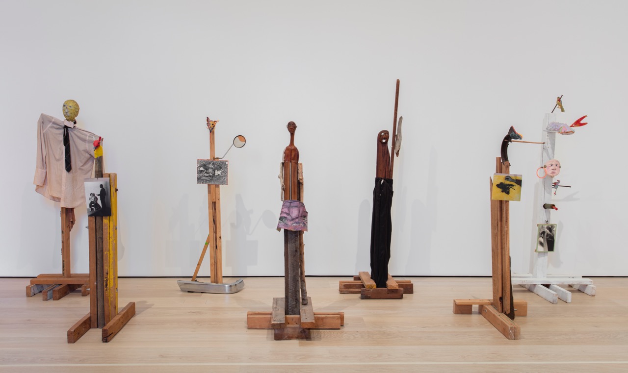 Jimmie Durham, Self-portrait, 1986. Canvas, cedar, acrylic paint, metal, synthetic hair, scrap fur, dyed chicken feathers, human rib bones, sheep bones, seashell, thread, 78 × 30 × 9 inches. Image courtesy Whitney Museum of American Art.