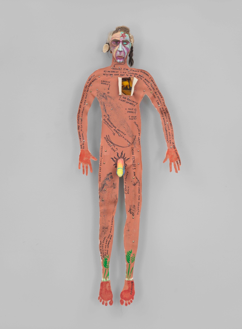 Among the almost two-hundred works in Jimmie Durham: At the Center of the World—astonishingly, the first US museum retrospective of an artist who played a key role in the postmodern turn of the 1980s—is his Self-portrait from 1986. The sculpture, which hangs from a nail on the wall, is made of canvas traced from Durham’s body, cut out and attached to a “skeleton” of found wooden and metal objects using upholstery tacks; it is painted a lurid, coppery red. The face is a wooden mask, again painted, perhaps to emulate some sort of Hollywood version of war paint, with synthetic hair and fur to stand for a braid, and turquoise beads and shells to indicate eyes and ears; the figure sports an impressive rainbow-hued wooden penis, too. It is covered with text, this body, words in two different registers, two different voices—one of a clinician, perhaps a doctor or an anthropologist, and one that reads as Jimmie Durham’s own. The first makes “objective” observations about the figure—“Mr. Durham has stated he believes he has an addiction to alcohol, nicotine, and caffeine, and does not sleep well”; “Appendix scar”; “Useless nipple.” The second seeks to explain himself in a way that sounds like someone trying to put others at ease by being a shade too friendly and relatable: “I’m basically lighthearted”; “I have 12 hobbies! 11 houseplants!”; “People like my poems.”