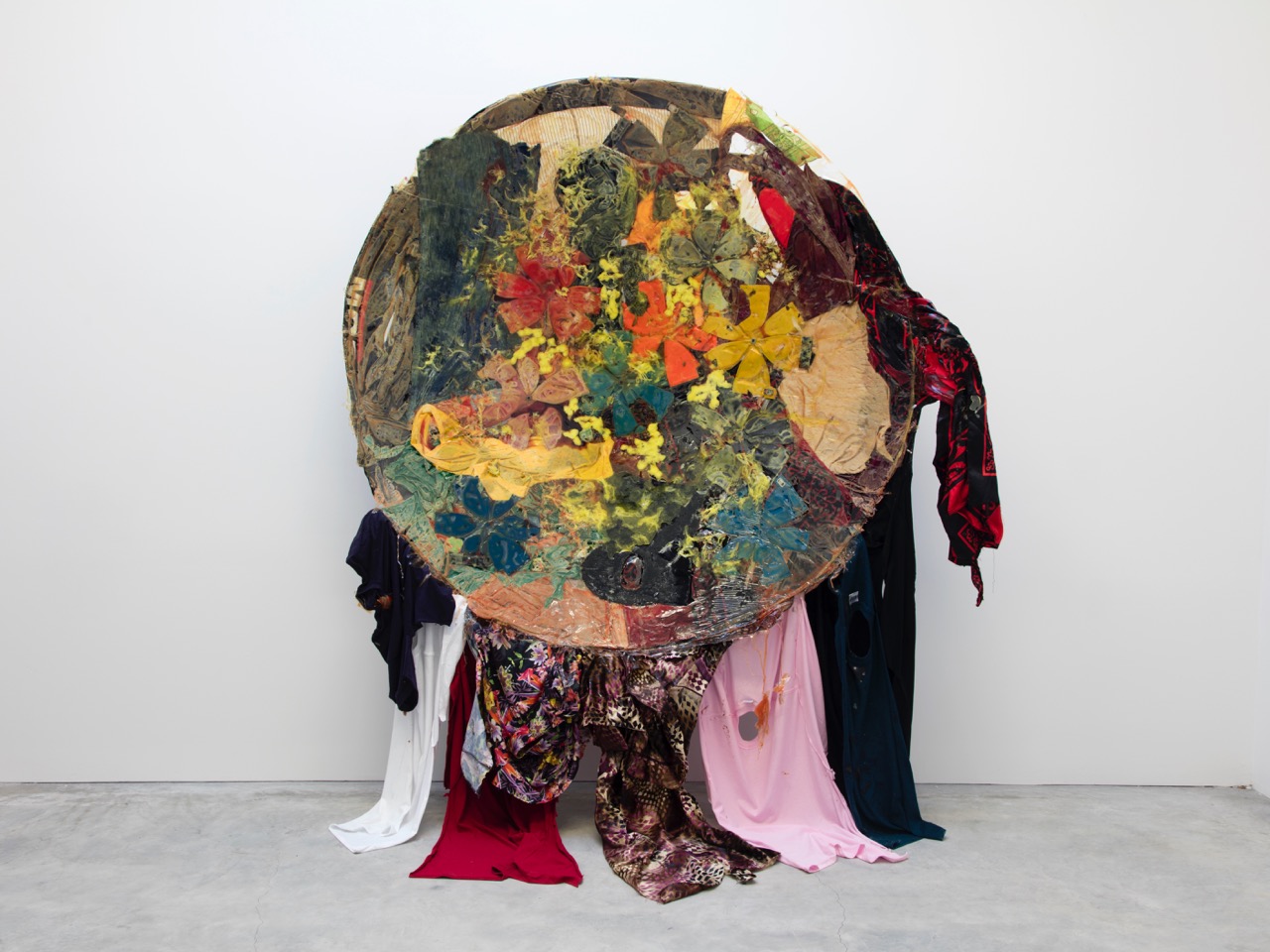 Kevin Beasley, A View of a Reflection, 2017. House dresses, kaftans, t-shirts, socks, du-rags, bandanas, altered garments, altered fitted caps, altered bed sheet, mouth guards, feathers, and resin, 82 ¼ × 178 × 5 ¼ inches. Image courtesy the artist and Casey Kaplan Gallery. Photo: Jason Wyche. © Kevin Beasley.