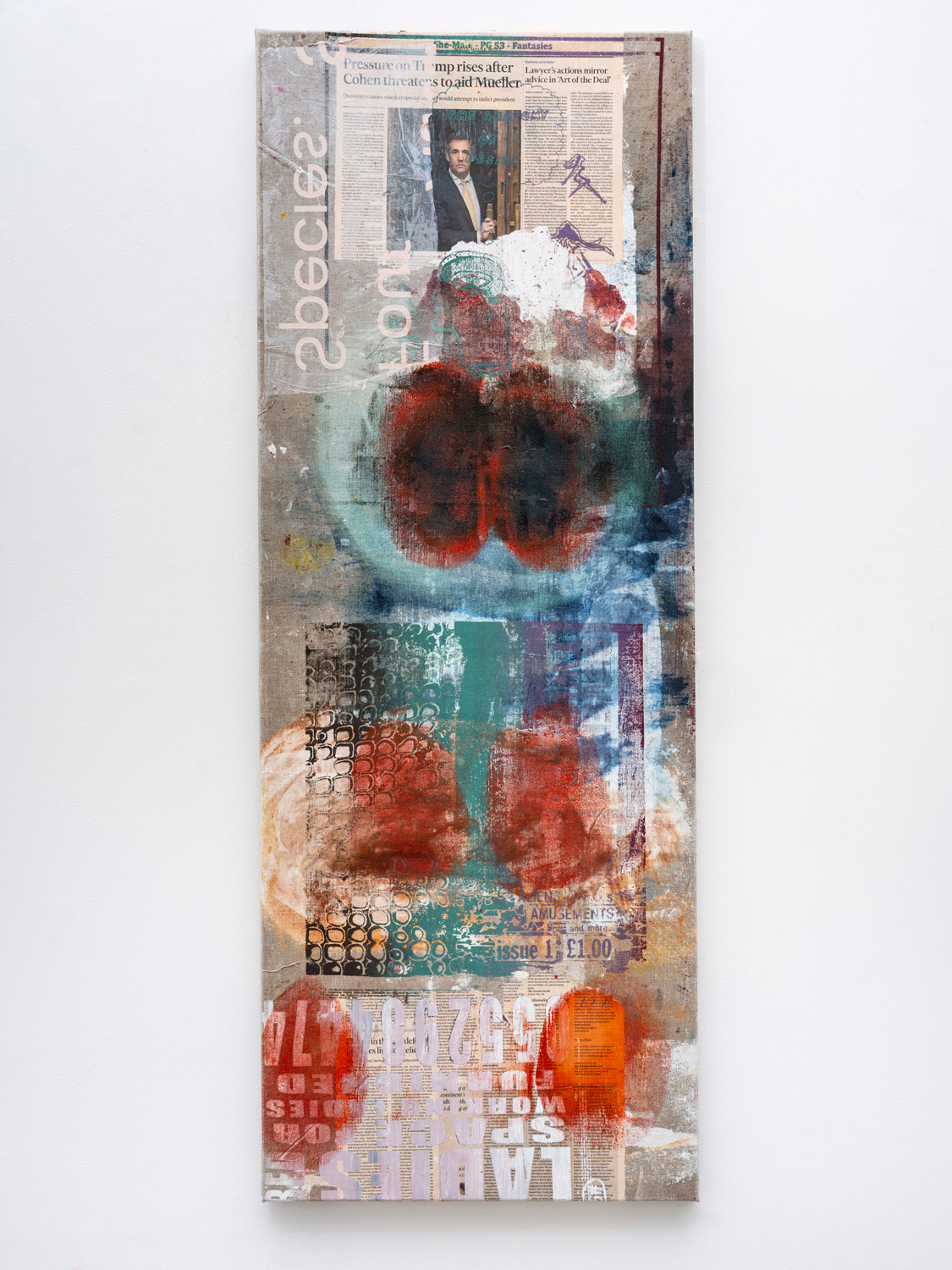 Take for example, El-Sayegh’s estimated at XX, a floor work in Lehmann Maupin’s second gallery composed of ninety-one latex-covered collages, each measuring approximately twenty-three by thirty-nine inches—the size of a human torso, the artist tells us. Your feet slip and squish a bit as the latex membranes—colored in rusts, reds, orangey-pinks, ferrous blues, and bilious greens—move and even tear underneath your steps. Look carefully and you will recognize below the rubbery surface layers upon layers of newspaper articles ripped from the Financial Times and the South China Morning Post, medical illustrations, ads for luxury goods, bits of textiles gathered from her family, calligraphic studies of Arabic lettering by her father, and other printed matter. It is as if you were traversing the flayed skin of an entity whose flesh and bone are an accumulation of detritus ripped so entirely out of its context as to become meaningless. This body makes no sense, which is precisely El-Sayegh’s goal.