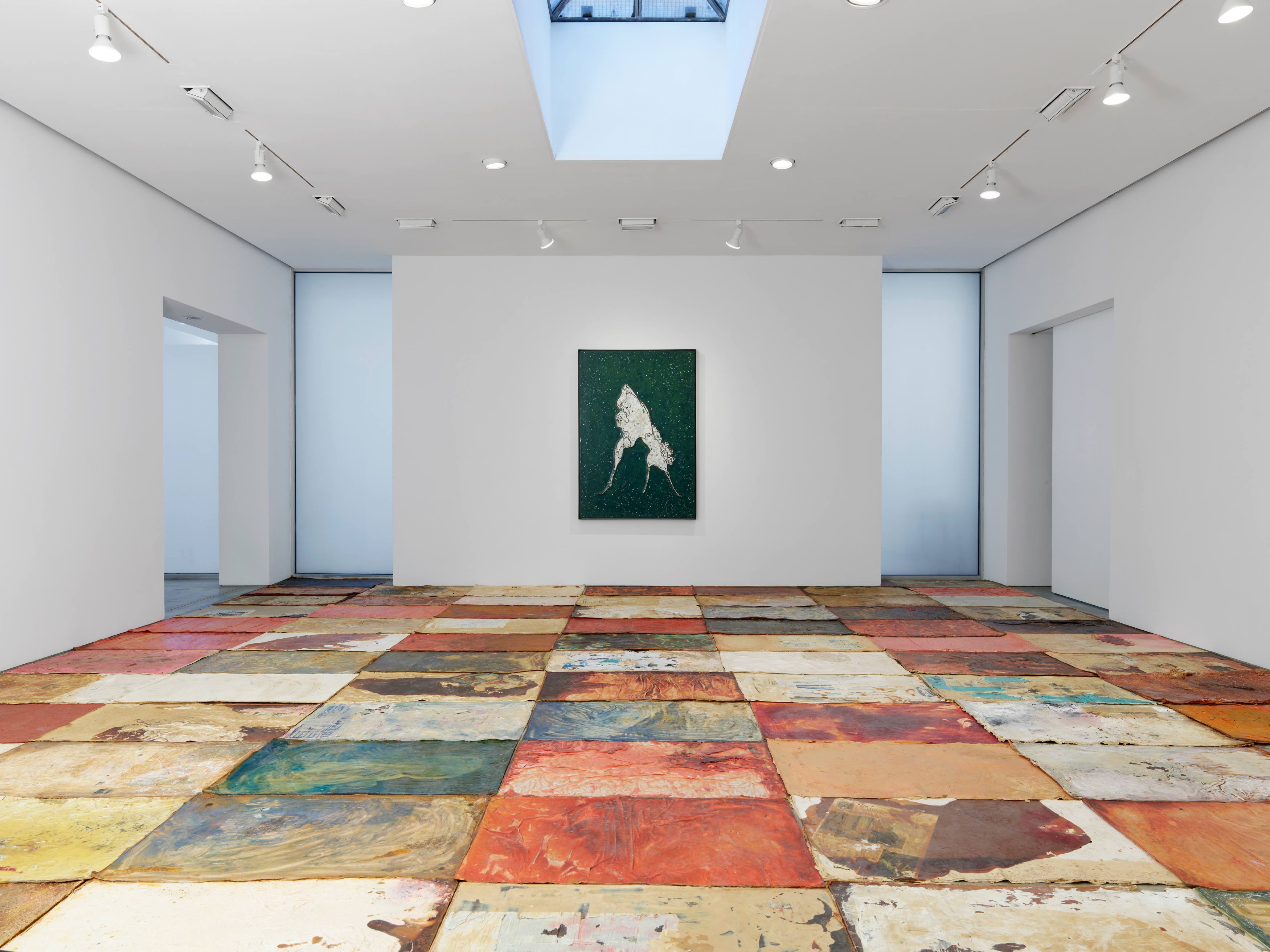 The bulk of the exhibition comprises works from Lee Bul’s series Perdu and El-Sayegh’s series Proofs, all done 2020–21, which are hung side by side in three rooms of the gallery. Though a departure from the medium for which she is best known, Lee Bul’s panels retain a sculptural feel: they are composed of acrylic mixed with mother-of-pearl chips applied thickly to a wooden support, so that the glinting mineral surface often ripples and bulges. We seem to be looking at a vast, dimensionless space, or a slide seen under a microscope. On these grounds float fragmentary forms that veer between biological and artificial—amoebas and cells and aliens and nanorobots and spaceships at once. They also suggest a body—a hybridized, cyborg body—coming into formation, assembling itself as it drifts through the void. Her choices of color—lemon yellow, ultramarine, grays, and blues in Perdu LXIX; forest greens in Perdu XLVIII; red, white, and blue in Perdu LXXIX; gold in Perdu XLVI—are surprisingly fresh and even hopeful. The forms are weird and creepy, but also beautiful, and somehow poignant—they are, if not lost (the English meaning of the French word perdu), then at least searching, moving toward completeness.