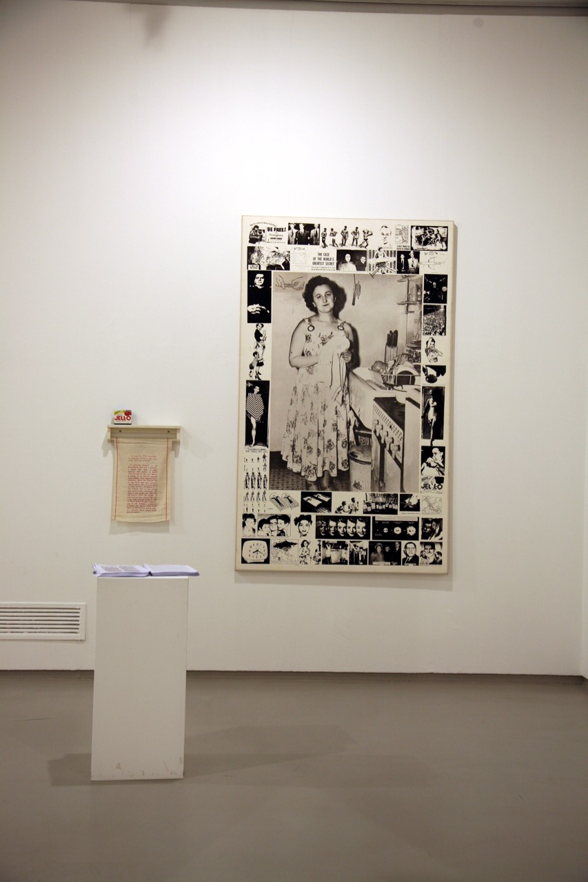 Martha Rosler, Unknown Secrets (The Secret of the Rosenbergs), 1988. Installation with screenprinted black-and-white photographs on canvas, wooden towel rack with stenciled towel and Jell-O box, and printed text handout. © Martha Rosler.
