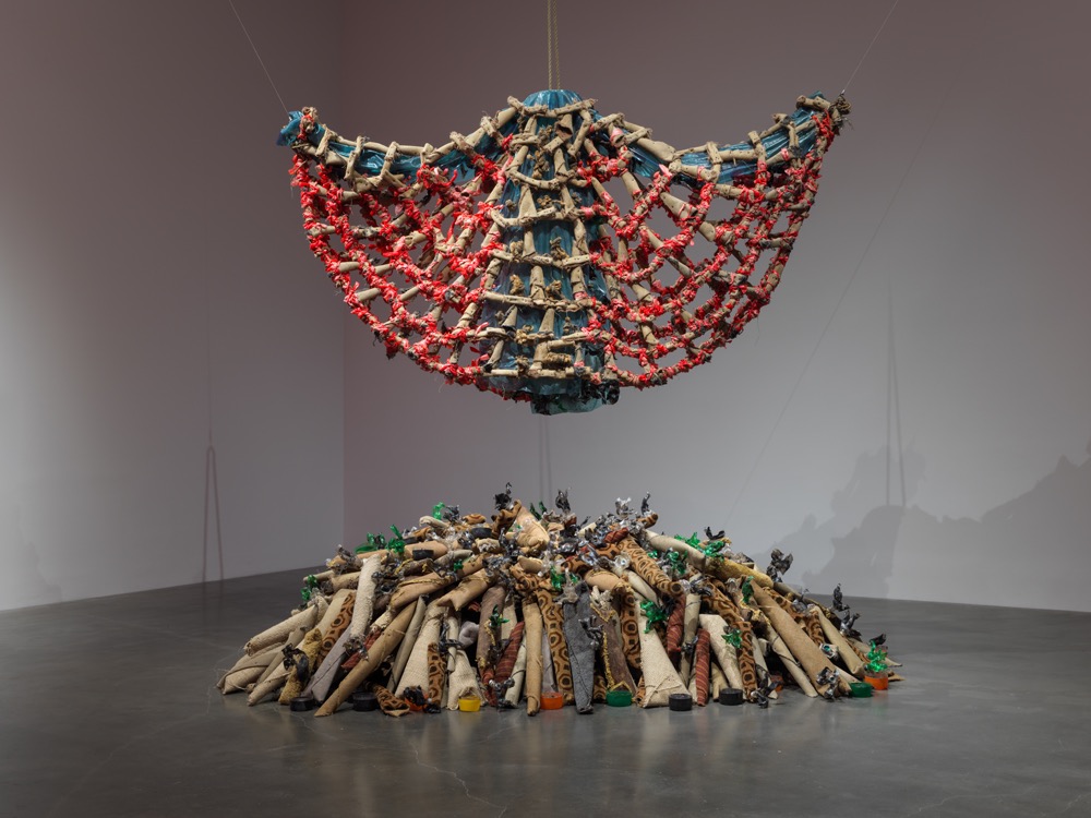 The same open-endedness characterizes much of the work that launched Ward’s career: Carpet Angel (shown in that 1993 debut at the New Museum) repurposes the rugs left by a previous tenant in his then-new studio into an abstracted angelic form, evoking spirituality through these discarded objects; Exodus (made for the 1993 Venice Biennale) speaks to diaspora and displacement—among many other things—with blocks of cast-off clothes and other items bundled up with flattened fire hose, scattered around the gallery floor, all oriented toward a gorgeous fabric mandala-like relief on the far wall. Even a later installation—2011’s We the People, which lends its title to his retrospective—cannot be pinned down: yes, these are the introductory words of the US Constitution, but when spelled out in individual colored shoelaces implanted into the wall and spilling down below, they suggest readings that range from the joys of multiculturalism to the hopeless fragmentation of the public sphere.