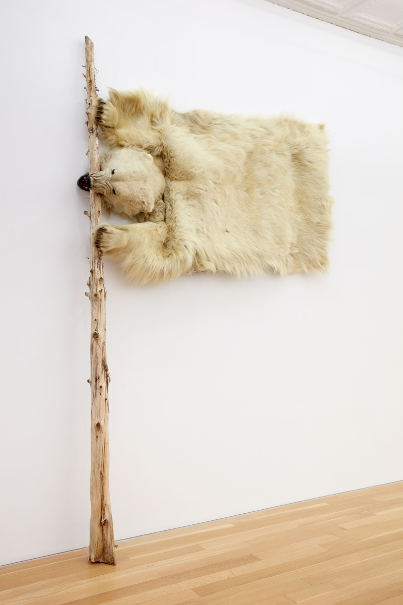 Nicholas Galanin, White Flag, 2022. Trimmed polar bear rug and wood. Courtesy Peter Blum Gallery.