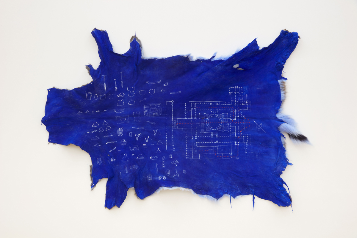 Nicholas Galanin, Architecture of return, escape (The British Museum), 2022. Pigment and acrylic on deer hide. Courtesy Peter Blum Gallery.