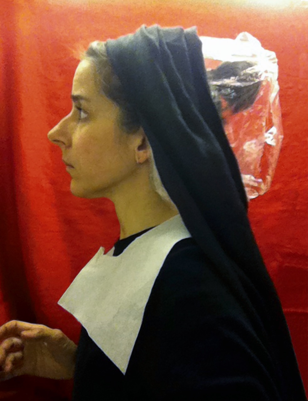 In a catalog essay from 2011, Katchadourian notes that the pictures in Seat Assignment “often fall into three of the most timeless art historical genres: still life, portrait, landscape.” Indeed, while her altitudinal efforts offer plenty of visual jokes, they also contain lots of shrewd references to the history of art making. The most famous of these—and the ones that are getting the most attention now, as museums around the world encourage housebound art lovers to recreate their favorite artworks at home—are Katchadourian’s Lavatory Self-Portraits in the Flemish Style. After spontaneously deciding to lock herself in the toilet to play dress-up with paper products on a domestic flight, which resulted in the first photo in the series, she expanded on the prototype during a long-haul trip. Toilet seat covers, paper towels, an eye mask, a neck pillow, and a disposable cup she gleaned on the plane, along with her deadpan expressions and distinctive poses, transfigure her—quite remarkably—into characters that would be at home in paintings by Robert Campin or Rogier van der Weyden or Jan van Eyck.