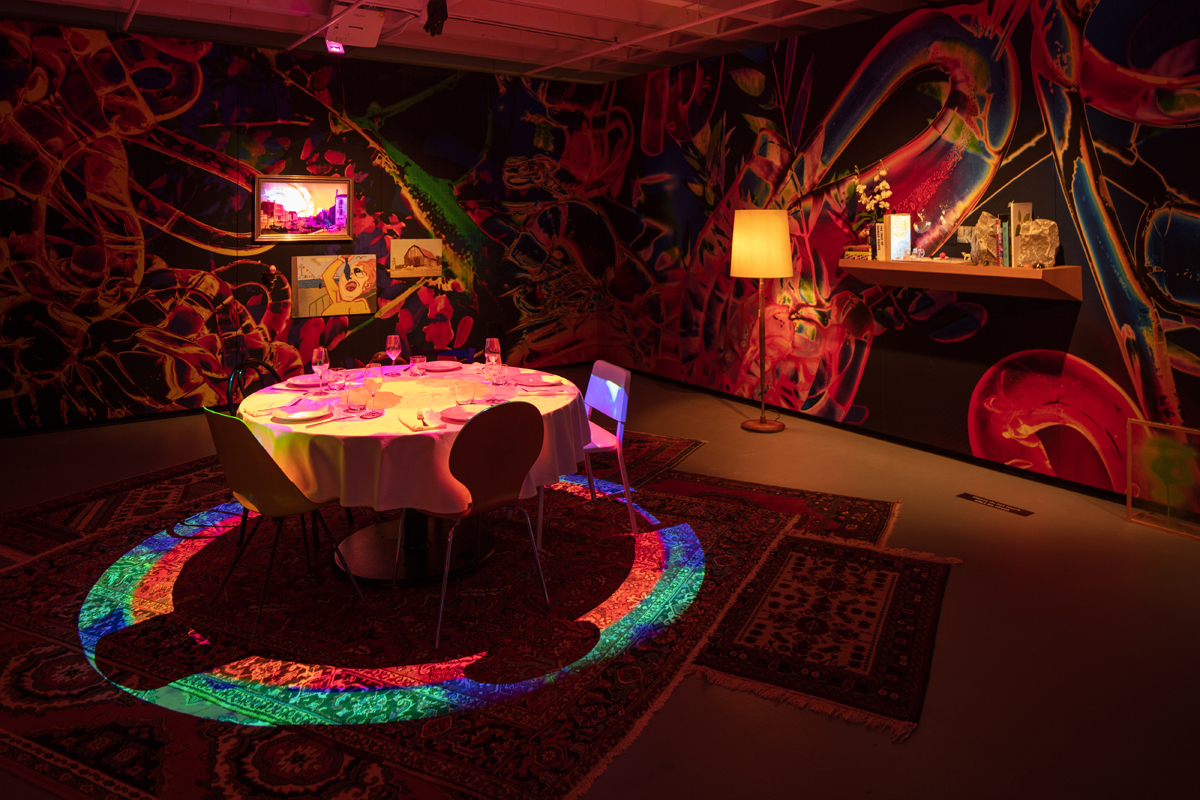 In the area Rist calls “The Apartment,” one finds a grouping of thirteen works dating from 2006 to 2019. Do Not Abandon Me Again (2015) is projected onto a bed. Caressing Dinner Circle (2017), whose images range from what looks to be a royal banquet to an abstract miasma of colors, is cast onto a dining table nearby. I Burn for You (2018) appears in the opening of a marble fireplace mantle. Prisma (2011) is screened on the surface of a faux veduta painting, so that the light from the video both enhances the whites of the painting and causes the image to dissolve. The fabric that covers the walls is imprinted with a simulated image of the underside of an eyelid (Reversed Eyelid from 2019). The overall effect is intimate and a bit surreal—as if an unconscious has taken up residence here, occupying every nook and cranny, turning this mundane domestic interior into a map of the hidden corners of a mind. After a seemingly endless stretch of working and schooling from home (at least for the more privileged among us), the installation feels like a portrait of our collective stir-craziness.