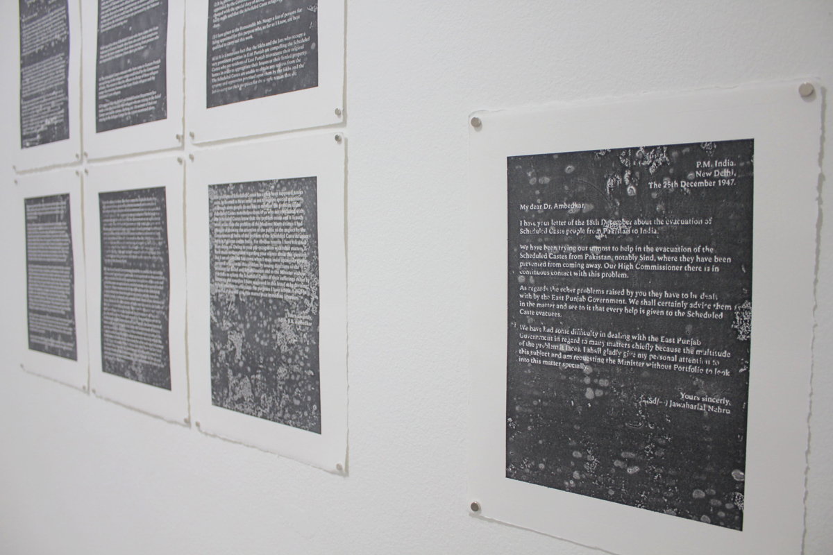 Proposals for a Memorial to Partition, installation view. Courtesy Twelve Gates Arts. Photo: Sahar Irshad. Pictured: Rajyashri Goody, Essential Services, 2003. Inkjet ink monotype on Arches paper.